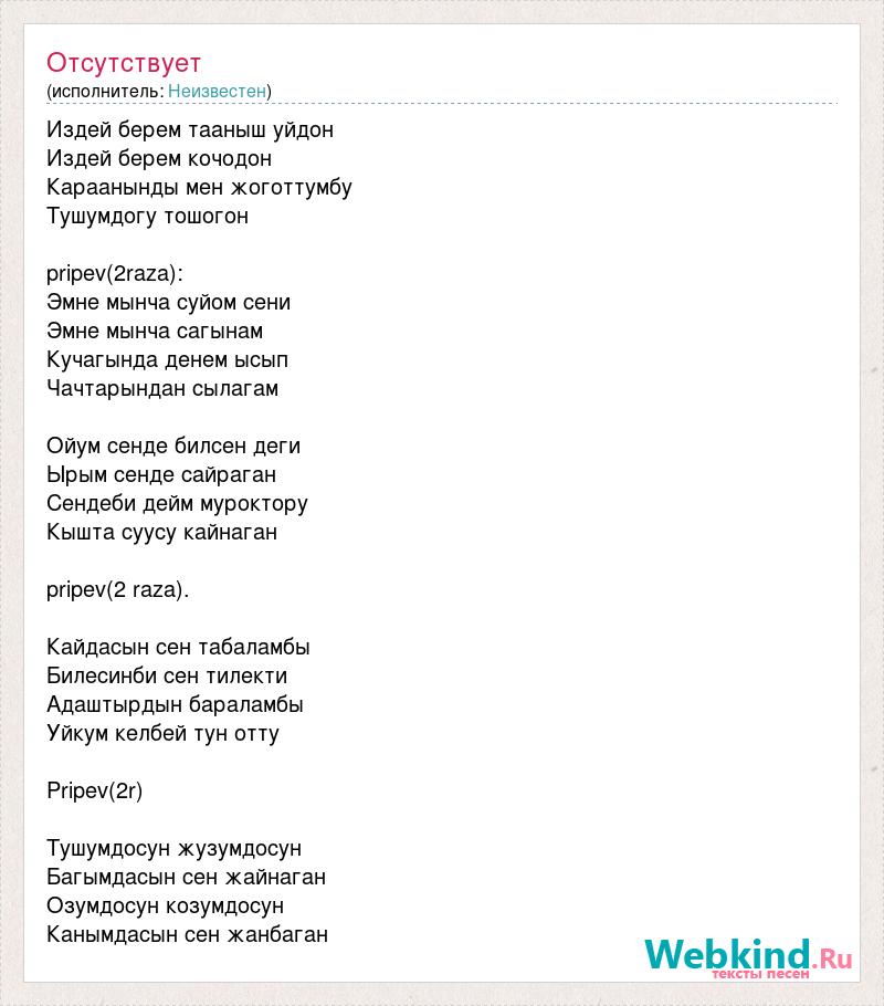 Издей берем тааныш уйдон Издей берем кочодон Караанынды мен жоготтумбу Тушумдогу тошогон pripev(2raza): Эмне мынча суйом сени Эмне мынча сагынам Кучагында денем ысып Чачтарындан сылагам Ойум сенде билсен деги Ырым сенде сайраган Сендеби дейм муроктору Кышта суусу кайнаган pripev(2 raza). Кайдасын сен табаламбы Билесинби сен тилекти Адаштырдын бараламбы Уйкум келбей тун отту Pripev(2r) Тушумдосун жузумдосун Багымдасын сен жайнаган Озумдосун козумдосун Канымдасын сен жанбаган
