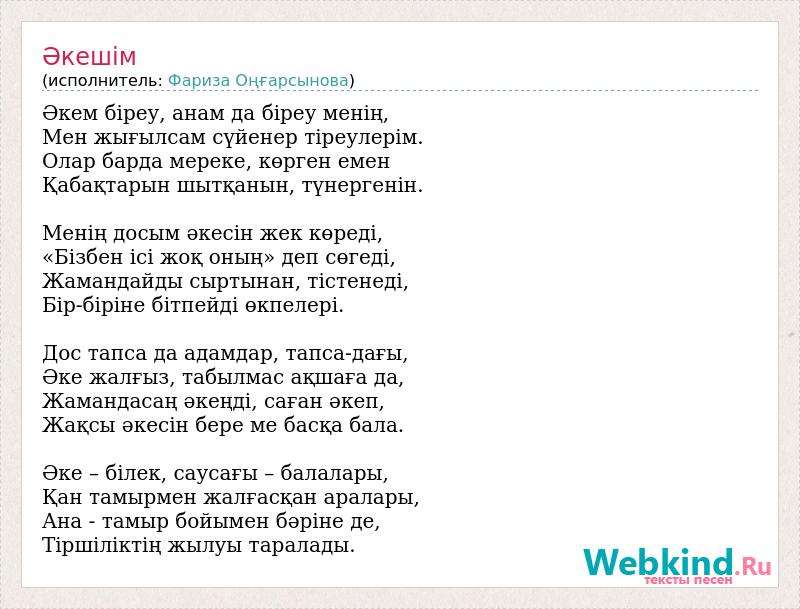 Әкем біреу, анам да біреу менің, Мен жығылсам сүйенер тіреулерім. Олар барда мереке, көрген емен Қабақтарын шытқанын, түнергенін. Менің досым әкесін жек көреді, «Бізбен ісі жоқ оның» деп сөгеді, Жамандайды сыртынан, тістенеді, Бір-біріне бітпейді өкпелері. Дос тапса да адамдар, тапса-дағы, Әке жалғыз, табылмас ақшаға да, Жамандасаң әкеңді, саған әкеп, Жақсы әкесін бере ме басқа бала. Әке – білек, саусағы – балалары, Қан тамырмен жалғасқан аралары, Ана - тамыр бойымен бәріне де, Тіршіліктің жылуы таралады.