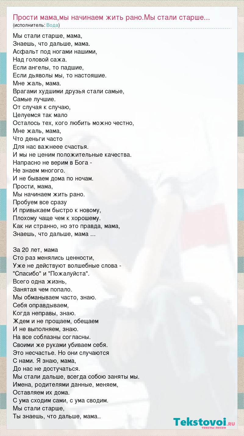 Мы стали старше, мама, Знаешь, что дальше, мама. Асфальт под ногами нашими, Над головой сажа. Если ангелы, то падшие, Если дьяволы мы, то настояшие. Мне жаль, мама. Врагами худшими друзья стали самые, Самые лучшие. От случая к случаю, Целуемся так мало Осталось тех, кого любить можно честно, Мне жаль, мама, Что деньги часто Для нас важнеее счастья. И мы не ценим положительные качества. Напрасно не верим в Бога - Не знаем многого. И не бываем дома по ночам. Прости, мама, Мы начинаем жить рано. Пробуем все сразу И привыкаем быстро к новому, Плохому чаще чем к хорошему. Как ни странно, но это правда, мама, Знаешь, что дальше, мама ... За 20 лет, мама Сто раз менялись ценности, Уже не действуют волшебные слова - "Спасибо" и "Пожалуйста". Всего одна жизнь, Занятая чем попало. Мы обманываем часто, знаю. Себя оправдываем, Когда неправы, знаю. Ждем и не прощаем, обещаем И не выполняем, знаю. На все соблазны согласны. Своими же руками убиваем себя. Это несчастье. Но они случаются С нами. Я знаю, мама, До нас не достучаться. Мы стали дальше, всегда собою заняты мы. Имена, родителями данные, меняем, Оставляем их дома. С ума сходим сами, с ума сводим. Мы стали старше, Ты знаешь, что дальше, мама..