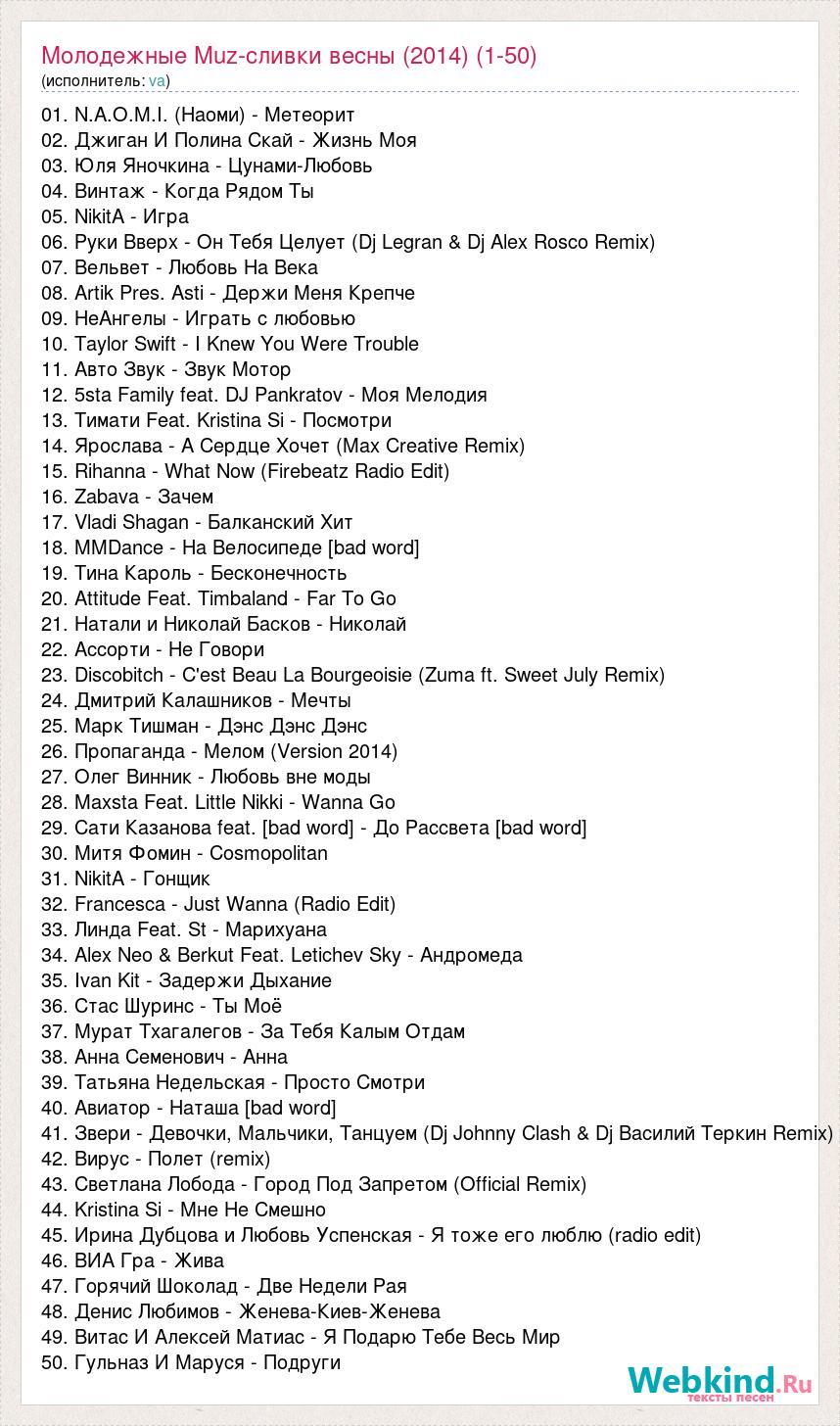 01. N.A.O.M.I. (Наоми) - Метеорит 02. Джиган И Полина Скай - Жизнь Моя 03. Юля Яночкина - Цунами-Любовь 04. Винтаж - Когда Рядом Ты 05. NikitA - Игра 06. Руки Вверх - Он Тебя Целует (Dj Legran & Dj Alex Rosco Remix) 07. Вельвет - Любовь На Века 08. Artik Pres. Asti - Держи Меня Крепче 09. НеАнгелы - Играть с любовью 10. Taylor Swift - I Knew You Were Trouble 11. Авто Звук - Звук Мотор 12. 5sta Family feat. DJ Pankratov - Моя Мелодия 13. Тимати Feat. Kristina Si - Посмотри 14. Ярослава - А Сердце Хочет (Max Creative Remix) 15. Rihanna - What Now (Firebeatz Radio Edit) 16. Zabava - Зачем 17. Vladi Shagan - Балканский Хит 18. MMDance - На Велосипеде [bad word] 19. Тина Кароль - Бесконечность 20. Attitude Feat. Timbaland - Far To Go 21. Натали и Николай Басков - Николай 22. Ассорти - Не Говори 23. Discobitch - C'est Beau La Bourgeoisie (Zuma ft. Sweet July Remix) 24. Дмитрий Калашников - Мечты 25. Марк Тишман - Дэнс Дэнс Дэнс 26. Пропаганда - Мелом (Version 2014) 27. Олег Винник - Любовь вне моды 28. Maxsta Feat. Little Nikki - Wanna Go 29. Сати Казанова feat. [bad word] - До Рассвета [bad word] 30. Митя Фомин - Cosmopolitan 31. NikitA - Гонщик 32. Francesca - Just Wanna (Radio Edit) 33. Линда Feat. St - Марихуана 34. Alex Neo & Berkut Feat. Letichev Sky - Андромеда 35. Ivan Kit - Задержи Дыхание 36. Стас Шуринс - Ты Моё 37. Мурат Тхагалегов - За Тебя Калым Отдам 38. Анна Семенович - Анна 39. Татьяна Недельская - Просто Смотри 40. Авиатор - Наташа [bad word] 41. Звери - Девочки, Мальчики, Танцуем (Dj Johnny Clash & Dj Василий Теркин Remix) 42. Вирус - Полет (remix) 43. Светлана Лобода - Город Под Запретом (Official Remix) 44. Kristina Si - Мне Не Смешно 45. Ирина Дубцова и Любовь Успенская - Я тоже его люблю (radio edit) 46. ВИА Гра - Жива 47. Горячий Шоколад - Две Недели Рая 48. Денис Любимов - Женева-Киев-Женева 49. Витас И Алексей Матиас - Я Подарю Тебе Весь Мир 50. Гульназ И Маруся - Подруги