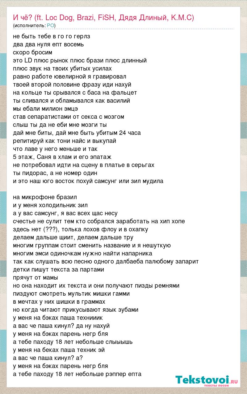 не быть тебе в го го герлз два два нуля епт восемь скоро бросим это LD плюс рынок плюс брази плюс длинный плюс звук на твоих убитых усилах равно работе ювелирной я гравировал твоей второй половине фразу иди нахуй на кольце ты срывался с баса на фальцет ты сливался и обламывался как василий мы ебали милион эмцэ став сепаратистами от секса с мозгом слыш ты да не еби мне мозги ты дай мне биты, дай мне быть убитым 24 часа репитируй как тони найс и выкупай что лаве у него меньше и так 5 этаж, Саня в хлам и его эпатаж не потребовал идти на сцену в платье в серьгах ты пидорас, а не номер один и это наш юго восток похуй самсунг или зил мудила на микрофоне бразил и у меня холодильник зил а у вас самсунг, я вас всех щас несу счестье не сулит тем кто собрался заработать на хип хопе здесь нет (???), толька лохов флоу и в охапку делаем дальше щиит, делаем дальше тру многим группам стоит сменить название и я нешуткую многим эмси одиночкам нужно найти напарника так как слушать всю песню одного далбаеба палюбому запарит детки пишут текста за партами прячут от мамы но она находит их текста и они получают пизды ремнями пиздуют смотреть мультик мишки гамми в мечтах у них шишки в граммах но когда читают прикусывают язык зубами у меня на бэках паша технииик а вас че паша кинул? да ну нахуй у меня на бэках парень негр бля а тебе паходу 18 лет небольше слыыышь у меня на беках паша техник эй а вас че паша кинул? а? у меня на бэках парень негр бля а тебе паходу 18 лет небольше рэппер епта