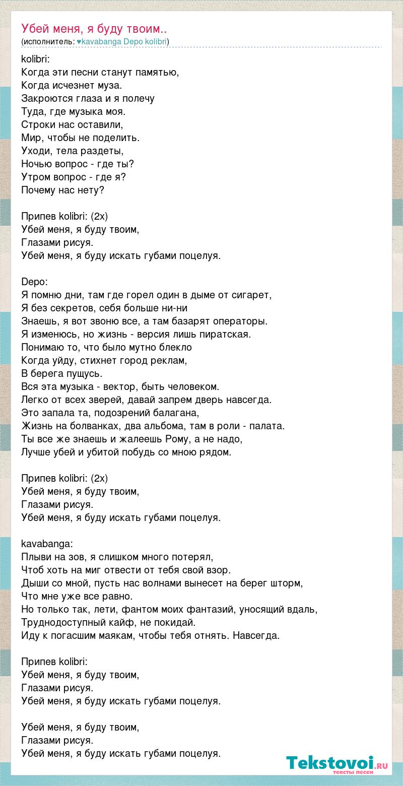 kolibri: Когда эти песни станут памятью, Когда исчезнет муза. Закроются глаза и я полечу Туда, где музыка моя. Строки нас оставили, Мир, чтобы не поделить. Уходи, тела раздеты, Ночью вопрос - где ты? Утром вопрос - где я? Почему нас нету? Припев kolibri: (2х) Убей меня, я буду твоим, Глазами рисуя. Убей меня, я буду искать губами поцелуя. Depo: Я помню дни, там где горел один в дыме от сигарет, Я без секретов, себя больше ни-ни Знаешь, я вот звоню все, а там базарят операторы. Я изменюсь, но жизнь - версия лишь пиратская. Понимаю то, что было мутно блекло Когда уйду, стихнет город реклам, В берега пущусь. Вся эта музыка - вектор, быть человеком. Легко от всех зверей, давай запрем дверь навсегда. Это запала та, подозрений балагана, Жизнь на болванках, два альбома, там в роли - палата. Ты все же знаешь и жалеешь Рому, а не надо, Лучше убей и убитой побудь со мною рядом. Припев kolibri: (2х) Убей меня, я буду твоим, Глазами рисуя. Убей меня, я буду искать губами поцелуя. kavabanga: Плыви на зов, я слишком много потерял, Чтоб хоть на миг отвести от тебя свой взор. Дыши со мной, пусть нас волнами вынесет на берег шторм, Что мне уже все равно. Но только так, лети, фантом моих фантазий, уносящий вдаль, Труднодоступный кайф, не покидай. Иду к погасшим маякам, чтобы тебя отнять. Навсегда. Припев kolibri: Убей меня, я буду твоим, Глазами рисуя. Убей меня, я буду искать губами поцелуя. Убей меня, я буду твоим, Глазами рисуя. Убей меня, я буду искать губами поцелуя.
