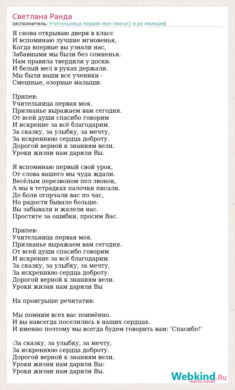 Я снова открываю двери в класс И вспоминаю лучшие мгновенья, Когда впервые вы узнали нас, Забавными мы были без сомненья. Нам правила твердили у доски. И белый мел в руках держали. Мы были ваши все ученики - Смешные, озорные малыши. Припев: Учительница первая моя. Признанье выражаем вам сегодня. От всей души спасибо говорим И искренне за всё благодарим. За сказку, за улыбку, за мечту, За искреннюю сердца доброту. Дорогой верной к знаниям вели. Уроки жизни нам дарили Вы. Я вспоминаю первый свой урок, От слова вашего мы чуда ждали. Весёлым перезвоном пел звонок, А мы в тетрадках палочки писали. До боли огорчали вас по час, Но радости бывало больше. Вы забывали и жалели нас. Простите за ошибки, просим Вас. Припев: Учительница первая моя. Признанье выражаем вам сегодня. От всей души спасибо говорим И искренне за всё благодарим. За сказку, за улыбку, за мечту, За искреннюю сердца доброту. Дорогой верной к знаниям вели. Уроки жизни нам дарили Вы На проигрыше речитатив: Мы помним всех вас поимённо. И вы навсегда поселились в наших сердцах. И именно поэтому мы всегда будем говорить вам: 'Спасибо!' :За сказку, за улыбку, за мечту, За искреннюю сердца доброту. Дорогой верной к знаниям вели. Уроки жизни нам дарили Вы: Уроки жизни нам дарили Вы.
