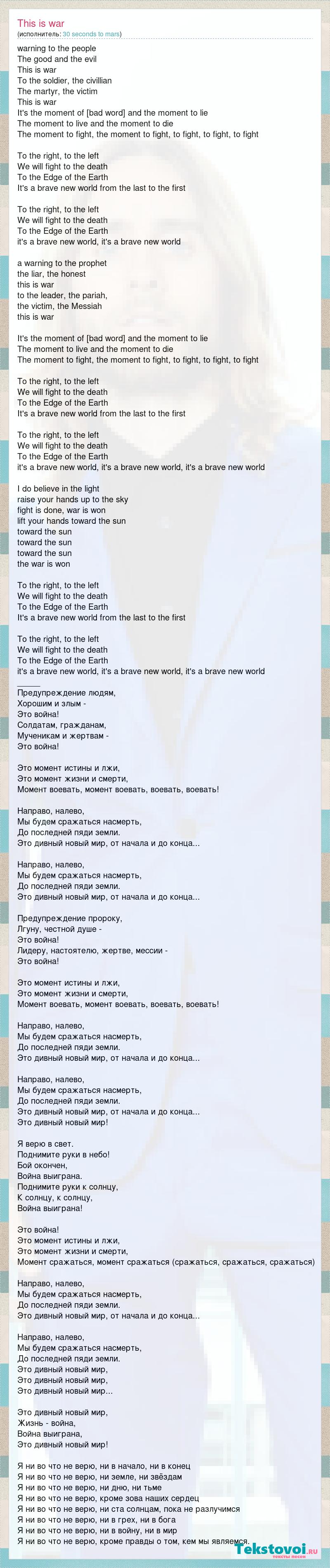 warning to the people The good and the evil This is war To the soldier, the civillian The martyr, the victim This is war It's the moment of truth and the moment to lie The moment to live and the moment to die The moment to fight, the moment to fight, to fight, to fight, to fight To the right, to the left We will fight to the death To the Edge of the Earth It's a brave new world from the last to the first To the right, to the left We will fight to the death To the Edge of the Earth it's a brave new world, it's a brave new world a warning to the prophet the liar, the honest this is war to the leader, the pariah, the victim, the Messiah this is war It's the moment of truth and the moment to lie The moment to live and the moment to die The moment to fight, the moment to fight, to fight, to fight, to fight To the right, to the left We will fight to the death To the Edge of the Earth It's a brave new world from the last to the first To the right, to the left We will fight to the death To the Edge of the Earth it's a brave new world, it's a brave new world, it's a brave new world I do believe in the light raise your hands up to the sky fight is done, war is won lift your hands toward the sun toward the sun toward the sun toward the sun the war is won To the right, to the left We will fight to the death To the Edge of the Earth It's a brave new world from the last to the first To the right, to the left We will fight to the death To the Edge of the Earth it's a brave new world, it's a brave new world, it's a brave new world _____ Предупреждение людям, Хорошим и злым - Это война! Солдатам, гражданам, Мученикам и жертвам - Это война! Это момент истины и лжи, Это момент жизни и смерти, Момент воевать, момент воевать, воевать, воевать! Направо, налево, Мы будем сражаться насмерть, До последней пяди земли. Это дивный новый мир, от начала и до конца... Направо, налево, Мы будем сражаться насмерть, До последней пяди земли. Это дивный новый мир, от начала и до конца... Предупреждение пророку, Лгуну, честной душе - Это война! Лидеру, настоятелю, жертве, мессии - Это война! Это момент истины и лжи, Это момент жизни и смерти, Момент воевать, момент воевать, воевать, воевать! Направо, налево, Мы будем сражаться насмерть, До последней пяди земли. Это дивный новый мир, от начала и до конца... Направо, налево, Мы будем сражаться насмерть, До последней пяди земли. Это дивный новый мир, от начала и до конца... Это дивный новый мир! Я верю в свет. Поднимите руки в небо! Бой окончен, Война выиграна. Поднимите руки к солнцу, К солнцу, к солнцу, Война выиграна! Это война! Это момент истины и лжи, Это момент жизни и смерти, Момент сражаться, момент сражаться (сражаться, сражаться, сражаться) Направо, налево, Мы будем сражаться насмерть, До последней пяди земли. Это дивный новый мир, от начала и до конца... Направо, налево, Мы будем сражаться насмерть, До последней пяди земли. Это дивный новый мир, Это дивный новый мир, Это дивный новый мир... Это дивный новый мир, Жизнь - война, Война выиграна, Это дивный новый мир! Я ни во что не верю, ни в начало, ни в конец Я ни во что не верю, ни земле, ни звёздам Я ни во что не верю, ни дню, ни тьме Я ни во что не верю, кроме зова наших сердец Я ни во что не верю, ни ста солнцам, пока не разлучимся Я ни во что не верю, ни в грех, ни в бога Я ни во что не верю, ни в войну, ни в мир Я ни во что не верю, кроме правды о том, кем мы являемся.
