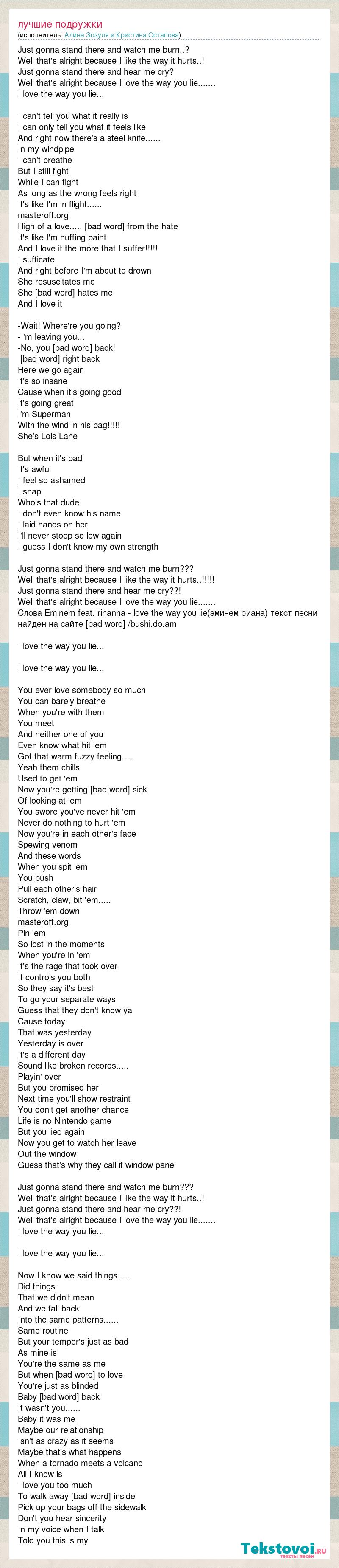 Just gonna stand there and watch me burn..? Well that's alright because I like the way it hurts..! Just gonna stand there and hear me cry? Well that's alright because I love the way you lie....... I love the way you lie... I can't tell you what it really is I can only tell you what it feels like And right now there's a steel knife...... In my windpipe I can't breathe But I still fight While I can fight As long as the wrong feels right It's like I'm in flight...... masteroff.org High of a love..... Drunk from the hate It's like I'm huffing paint And I love it the more that I suffer!!!!! I sufficate And right before I'm about to drown She resuscitates me She [bad word] hates me And I love it -Wait! Where're you going? -I'm leaving you... -No, you ain't! Come back! We're running right back Here we go again It's so insane Cause when it's going good It's going great I'm Superman With the wind in his bag!!!!! She's Lois Lane But when it's bad It's awful I feel so ashamed I snap Who's that dude I don't even know his name I laid hands on her I'll never stoop so low again I guess I don't know my own strength Just gonna stand there and watch me burn??? Well that's alright because I like the way it hurts..!!!!! Just gonna stand there and hear me cry??! Well that's alright because I love the way you lie....... Слова Eminem feat. rihanna - love the way you lie(эминем риана) текст песни найден на сайте [bad word] /bushi.do.am I love the way you lie... I love the way you lie... You ever love somebody so much You can barely breathe When you're with them You meet And neither one of you Even know what hit 'em Got that warm fuzzy feeling..... Yeah them chills Used to get 'em Now you're getting [bad word] sick Of looking at 'em You swore you've never hit 'em Never do nothing to hurt 'em Now you're in each other's face Spewing venom And these words When you spit 'em You push Pull each other's hair Scratch, claw, bit 'em..... Throw 'em down masteroff.org Pin 'em So lost in the moments When you're in 'em It's the rage that took over It controls you both So they say it's best To go your separate ways Guess that they don't know ya Cause today That was yesterday Yesterday is over It's a different day Sound like broken records..... Playin' over But you promised her Next time you'll show restraint You don't get another chance Life is no Nintendo game But you lied again Now you get to watch her leave Out the window Guess that's why they call it window pane Just gonna stand there and watch me burn??? Well that's alright because I like the way it hurts..! Just gonna stand there and hear me cry??! Well that's alright because I love the way you lie....... I love the way you lie... I love the way you lie... Now I know we said things .... Did things That we didn't mean And we fall back Into the same patterns...... Same routine But your temper's just as bad As mine is You're the same as me But when it comes to love You're just as blinded Baby please come back It wasn't you...... Baby it was me Maybe our relationship Isn't as crazy as it seems Maybe that's what happens When a tornado meets a volcano All I know is I love you too much To walk away though Come inside Pick up your bags off the sidewalk Don't you hear sincerity In my voice when I talk Told you this is my