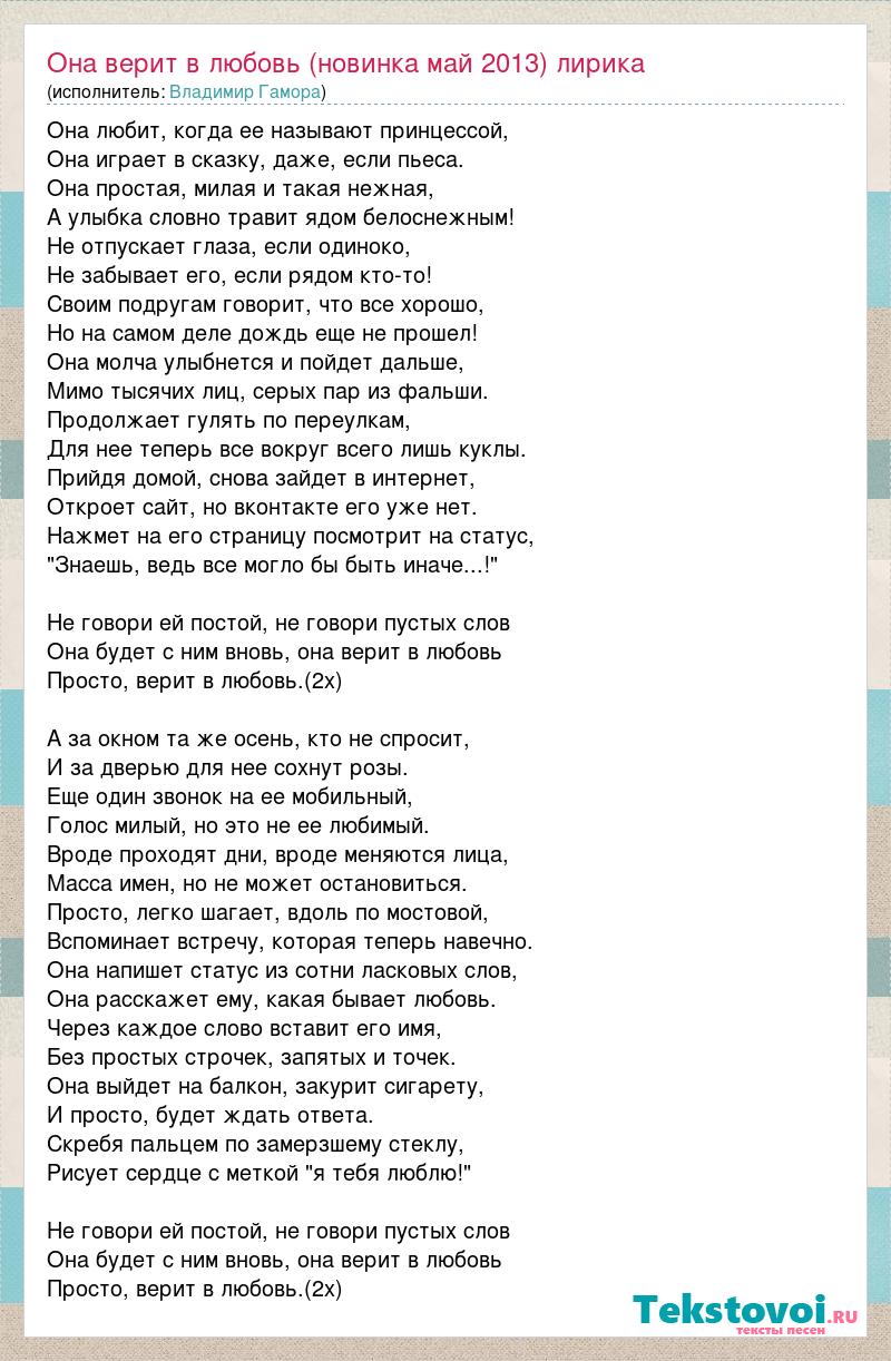 Она любит, когда ее называют принцессой, Она играет в сказку, даже, если пьеса. Она простая, милая и такая нежная, А улыбка словно травит ядом белоснежным! Не отпускает глаза, если одиноко, Не забывает его, если рядом кто-то! Своим подругам говорит, что все хорошо, Но на самом деле дождь еще не прошел! Она молча улыбнется и пойдет дальше, Мимо тысячих лиц, серых пар из фальши. Продолжает гулять по переулкам, Для нее теперь все вокруг всего лишь куклы. Прийдя домой, снова зайдет в интернет, Откроет сайт, но вконтакте его уже нет. Нажмет на его страницу посмотрит на статус, "Знаешь, ведь все могло бы быть иначе...!" Не говори ей постой, не говори пустых слов Она будет с ним вновь, она верит в любовь Просто, верит в любовь.(2х) А за окном та же осень, кто не спросит, И за дверью для нее сохнут розы. Еще один звонок на ее мобильный, Голос милый, но это не ее любимый. Вроде проходят дни, вроде меняются лица, Масса имен, но не может остановиться. Просто, легко шагает, вдоль по мостовой, Вспоминает встречу, которая теперь навечно. Она напишет статус из сотни ласковых слов, Она расскажет ему, какая бывает любовь. Через каждое слово вставит его имя, Без простых строчек, запятых и точек. Она выйдет на балкон, закурит сигарету, И просто, будет ждать ответа. Скребя пальцем по замерзшему стеклу, Рисует сердце с меткой "я тебя люблю!" Не говори ей постой, не говори пустых слов Она будет с ним вновь, она верит в любовь Просто, верит в любовь.(2х)