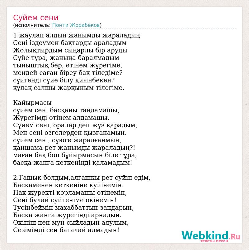 1.жаулап алдың жанымды жараладың Сені іздеумен бақтарды араладым Жолықтырдым сыңарлы бір аруды Сүйе тұра, жаныңа баралмадым тыныштық бер, өтінем жүрегіме, мендей саған біреу бақ тіледіме? сүйгенді сүйе білу қиынбекен? құлақ салшы жарқыным тілегіме. Кайырмасы сүйем сені басқаны таңдамашы, Жүрегімді өтінем алдамашы. Сүйем сені, оралар деп жүз қарадым, Мен сені өзгелерден қызғанамын. сүйем сені, сүюге жаралғанмын, қаншама рет жанымды жараладың?! маған бақ боп бұйырмасын біле тұра, басқа жанға кеткеніңді қаламадым! 2.Гашык болдым,алгашкы рет суйiп едім, Баскаменен кеткенiне куйiнемін. Пак журектi корламашы отiнемін, Сенi булай суйгенiме окiнемін! Тусiнбеймiн махаббаттын зандарын, Баска жанга журегiндi арнадын. Окiнiш пен мун сыйладын аяулым, Сезiмiмдi сен багалай алмадын!