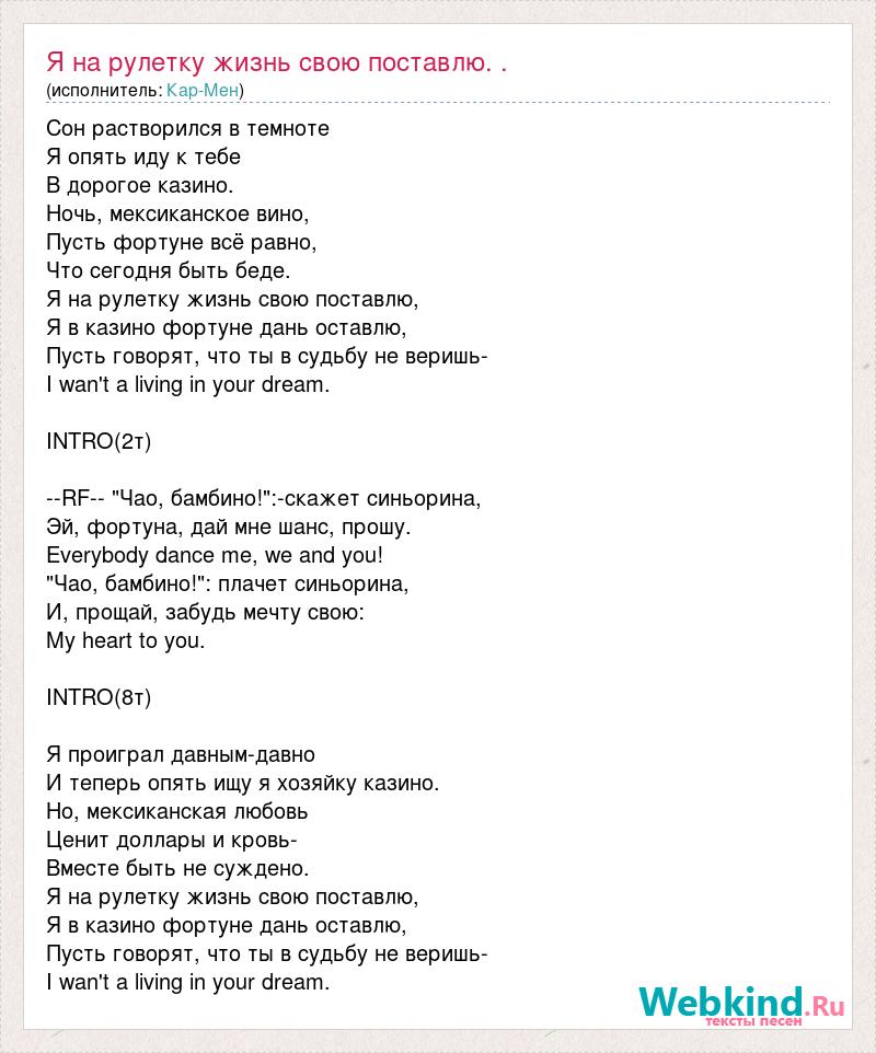 Сон растворился в темноте Я опять иду к тебе В дорогое казино. Ночь, мексиканское вино, Пусть фортуне всё равно, Что сегодня быть беде. Я на рулетку жизнь свою поставлю, Я в казино фортуне дань оставлю, Пусть говорят, что ты в судьбу не веришь- I wan't a living in your dream. INTRO(2т) --RF-- "Чао, бамбино!":-скажет синьорина, Эй, фортуна, дай мне шанс, прошу. Everybody dance me, we and you! "Чао, бамбино!": плачет синьорина, И, прощай, забудь мечту свою: My heart to you. INTRO(8т) Я проиграл давным-давно И теперь опять ищу я хозяйку казино. Но, мексиканская любовь Ценит доллары и кровь- Вместе быть не суждено. Я на рулетку жизнь свою поставлю, Я в казино фортуне дань оставлю, Пусть говорят, что ты в судьбу не веришь- I wan't a living in your dream.