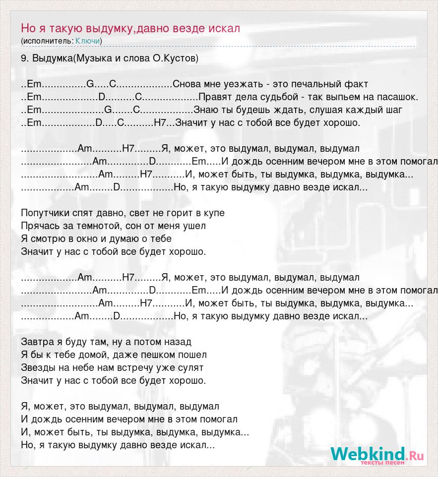 9. Выдумка(Музыка и слова О.Кустов) ..Em...............G.....C...................Снова мне уезжать - это печальный факт ..Em...................D..........C...................Правят дела судьбой - так выпьем на пасашок. ..Em.....................G.......C..................Знаю ты будешь ждать, слушая каждый шаг ..Em..................D.....C..........H7...Значит у нас с тобой все будет хорошо. ...................Am..........H7.........Я, может, это выдумал, выдумал, выдумал ........................Am..............D............Em.....И дождь осенним вечером мне в этом помогал ..........................Am.........H7...........И, может быть, ты выдумка, выдумка, выдумка... ..................Am........D..................Но, я такую выдумку давно везде искал... Попутчики спят давно, свет не горит в купе Прячась за темнотой, сон от меня ушел Я смотрю в окно и думаю о тебе Значит у нас с тобой все будет хорошо. ...................Am..........H7.........Я, может, это выдумал, выдумал, выдумал ........................Am..............D............Em.....И дождь осенним вечером мне в этом помогал ..........................Am.........H7...........И, может быть, ты выдумка, выдумка, выдумка... ..................Am........D..................Но, я такую выдумку давно везде искал... Завтра я буду там, ну а потом назад Я бы к тебе домой, даже пешком пошел Звезды на небе нам встречу уже сулят Значит у нас с тобой все будет хорошо. Я, может, это выдумал, выдумал, выдумал И дождь осенним вечером мне в этом помогал И, может быть, ты выдумка, выдумка, выдумка... Но, я такую выдумку давно везде искал...