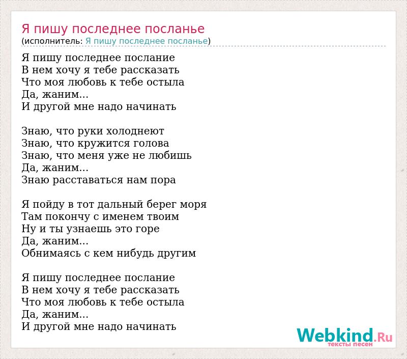 Я пишу последнее послание В нем хочу я тебе рассказать Что моя любовь к тебе остыла Да, жаним... И другой мне надо начинать Знаю, что руки холоднеют Знаю, что кружится голова Знаю, что меня уже не любишь Да, жаним... Знаю расставаться нам пора Я пойду в тот дальный берег моря Там покончу с именем твоим Ну и ты узнаешь это горе Да, жаним... Обнимаясь с кем нибудь другим Я пишу последнее послание В нем хочу я тебе рассказать Что моя любовь к тебе остыла Да, жаним... И другой мне надо начинать