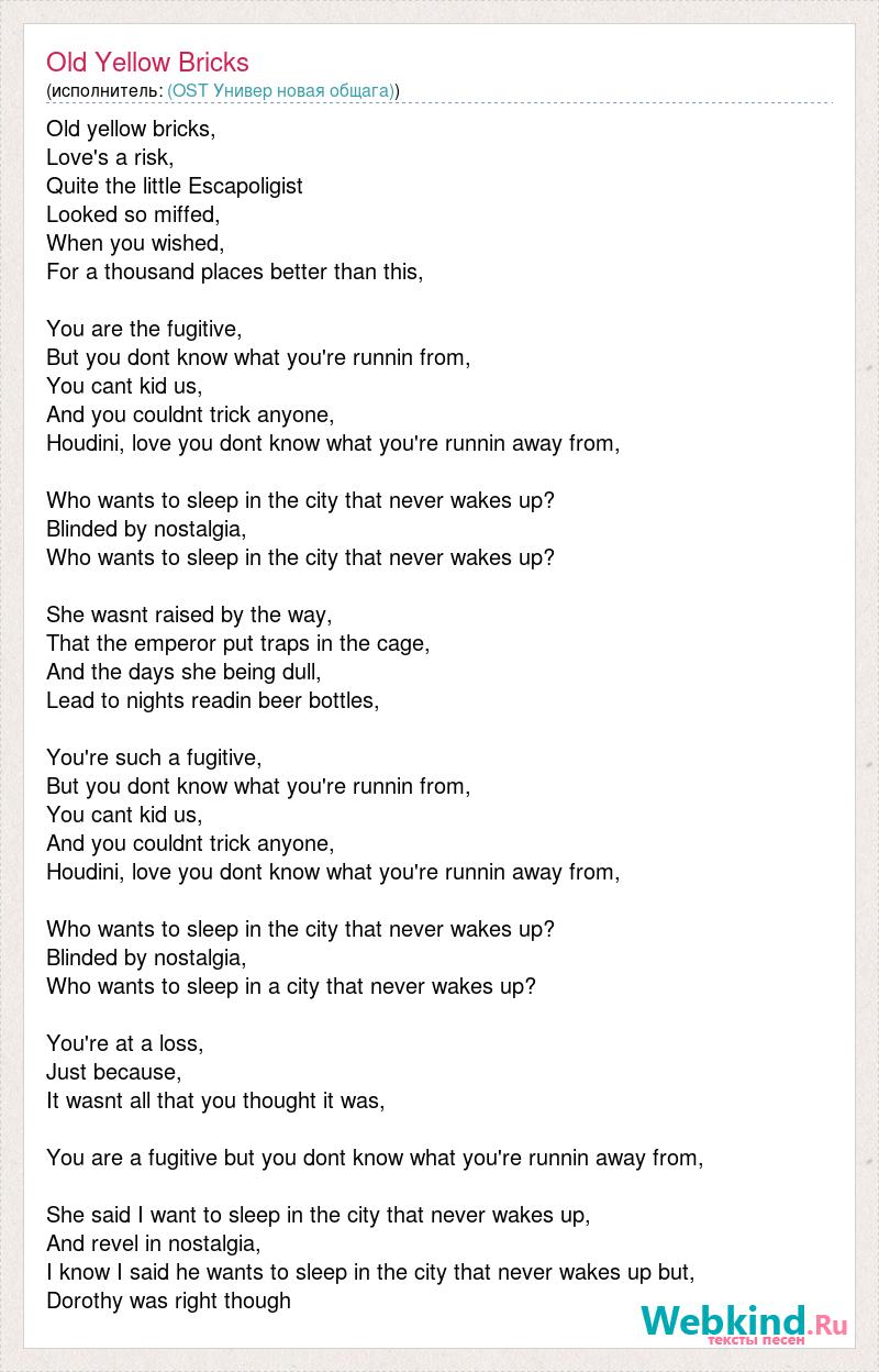 Old yellow bricks, Love's a risk, Quite the little Escapoligist Looked so miffed, When you wished, For a thousand places better than this, You are the fugitive, But you dont know what you're runnin from, You cant kid us, And you couldnt trick anyone, Houdini, love you dont know what you're runnin away from, Who wants to sleep in the city that never wakes up? Blinded by nostalgia, Who wants to sleep in the city that never wakes up? She wasnt raised by the way, That the emperor put traps in the cage, And the days she being dull, Lead to nights readin beer bottles, You're such a fugitive, But you dont know what you're runnin from, You cant kid us, And you couldnt trick anyone, Houdini, love you dont know what you're runnin away from, Who wants to sleep in the city that never wakes up? Blinded by nostalgia, Who wants to sleep in a city that never wakes up? You're at a loss, Just because, It wasnt all that you thought it was, You are a fugitive but you dont know what you're runnin away from, She said I want to sleep in the city that never wakes up, And revel in nostalgia, I know I said he wants to sleep in the city that never wakes up but, Dorothy was right though