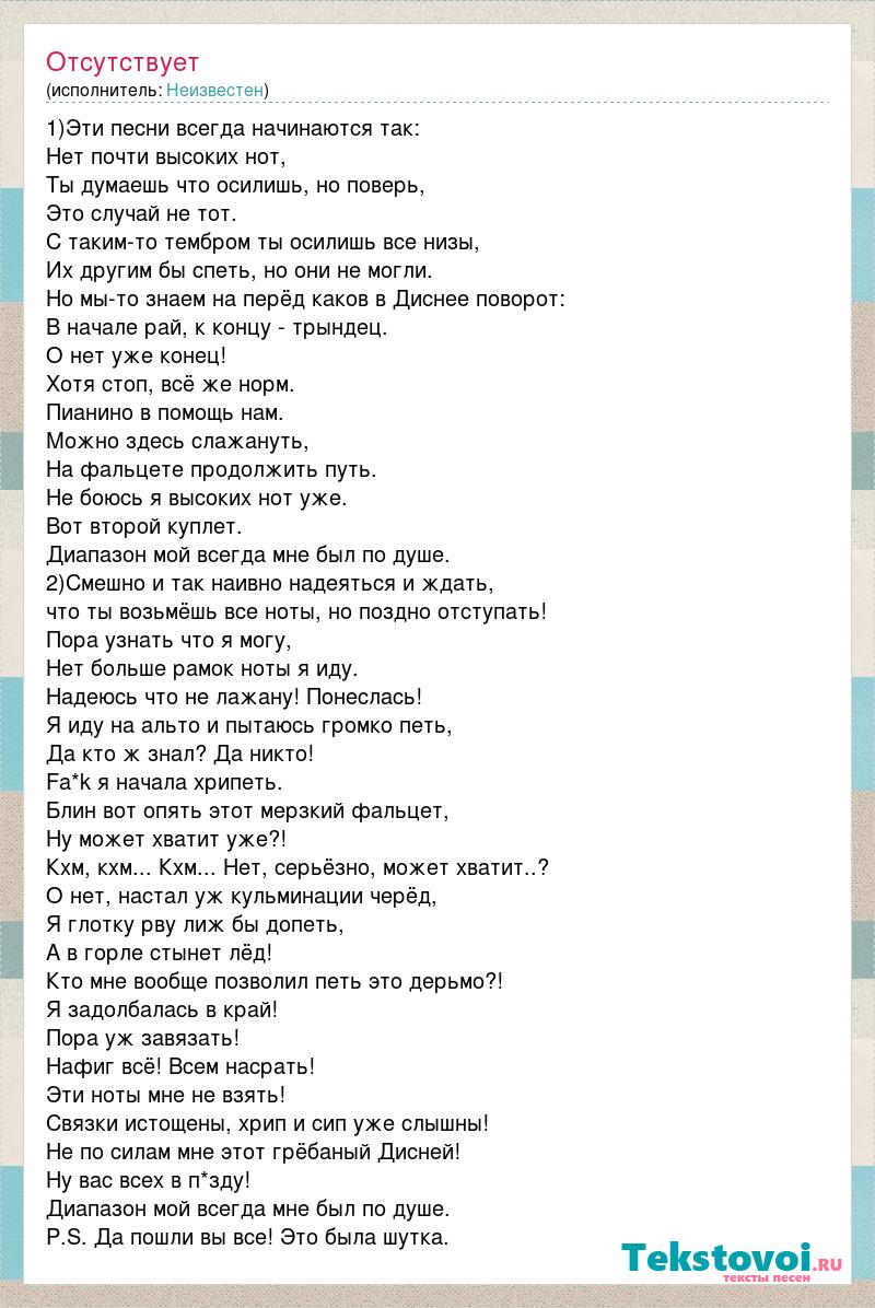 1)Эти песни всегда начинаются так: Нет почти высоких нот, Ты думаешь что осилишь, но поверь, Это случай не тот. С таким-то тембром ты осилишь все низы, Их другим бы спеть, но они не могли. Но мы-то знаем на перёд каков в Диснее поворот: В начале рай, к концу - трындец. О нет уже конец! Хотя стоп, всё же норм. Пианино в помощь нам. Можно здесь слажануть, На фальцете продолжить путь. Не боюсь я высоких нот уже. Вот второй куплет. Диапазон мой всегда мне был по душе. 2)Смешно и так наивно надеяться и ждать, что ты возьмёшь все ноты, но поздно отступать! Пора узнать что я могу, Нет больше рамок ноты я иду. Надеюсь что не лажану! Понеслась! Я иду на альто и пытаюсь громко петь, Да кто ж знал? Да никто! Fa*k я начала хрипеть. Блин вот опять этот мерзкий фальцет, Ну может хватит уже?! Кхм, кхм... Кхм... Нет, серьёзно, может хватит..? О нет, настал уж кульминации черёд, Я глотку рву лиж бы допеть, А в горле стынет лёд! Кто мне вообще позволил петь это дерьмо?! Я задолбалась в край! Пора уж завязать! Нафиг всё! Всем насрать! Эти ноты мне не взять! Связки истощены, хрип и сип уже слышны! Не по силам мне этот грёбаный Дисней! Ну вас всех в п*зду! Диапазон мой всегда мне был по душе. P.S. Да пошли вы все! Это была шутка.
