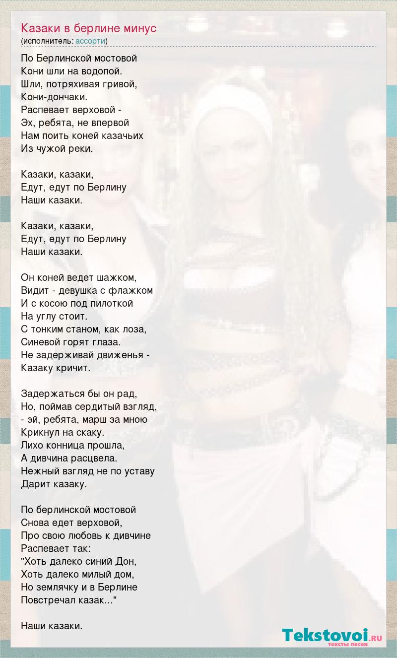 По Берлинской мостовой Кони шли на водопой. Шли, потряхивая гривой, Кони-дончаки. Распевает верховой - Эх, ребята, не впервой Нам поить коней казачьих Из чужой реки. Казаки, казаки, Едут, едут по Берлину Наши казаки. Казаки, казаки, Едут, едут по Берлину Наши казаки. Он коней ведет шажком, Видит - девушка с флажком И с косою под пилоткой На углу стоит. С тонким станом, как лоза, Синевой горят глаза. Не задерживай движенья - Казаку кричит. Задержаться бы он рад, Но, поймав сердитый взгляд, - эй, ребята, марш за мною Крикнул на скаку. Лихо конница прошла, А дивчина расцвела. Нежный взгляд не по уставу Дарит казаку. По берлинской мостовой Снова едет верховой, Про свою любовь к дивчине Распевает так: "Хоть далеко синий Дон, Хоть далеко милый дом, Но землячку и в Берлине Повстречал казак..." Наши казаки.