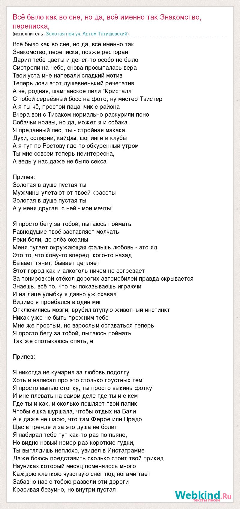 Главная→Исполнители→Золотая при уч. Артем Татищевский ft. Фиска Адвайта→Всё было как во сне, но да, всё именно так Знакомство, переписка, позже р