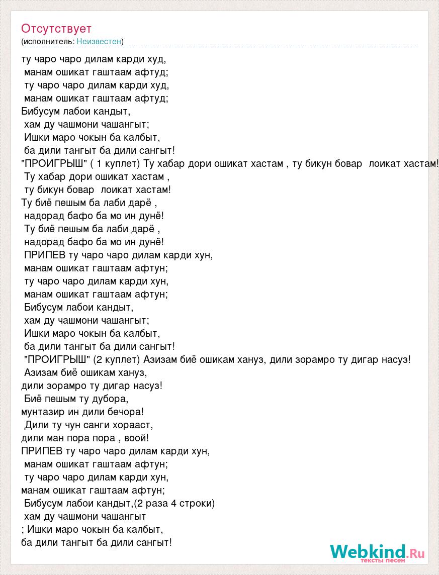 ту чаро чаро дилам карди худ, манам ошикат гаштаам афтуд; ту чаро чаро дилам карди худ, манам ошикат гаштаам афтуд; Бибусум лабои кандыт, хам ду чашмони чашангыт; Ишки маро чокын ба калбыт, ба дили тангыт ба дили сангыт! "ПРОИГРЫШ" ( 1 куплет) Ту хабар дори ошикат хастам , ту бикун бовар лоикат хастам! Ту хабар дори ошикат хастам , ту бикун бовар лоикат хастам! Ту биё пешым ба лаби дарё , надорад бафо ба мо ин дунё! Ту биё пешым ба лаби дарё , надорад бафо ба мо ин дунё! ПРИПЕВ ту чаро чаро дилам карди хун, манам ошикат гаштаам афтун; ту чаро чаро дилам карди хун, манам ошикат гаштаам афтун; Бибусум лабои кандыт, хам ду чашмони чашангыт; Ишки маро чокын ба калбыт, ба дили тангыт ба дили сангыт! "ПРОИГРЫШ" (2 куплет) Азизам биё ошикам хануз, дили зорамро ту дигар насуз! Азизам биё ошикам хануз, дили зорамро ту дигар насуз! Биё пешым ту дубора, мунтазир ин дили бечора! Дили ту чун санги хорааст, дили ман пора пора , воой! ПРИПЕВ ту чаро чаро дилам карди хун, манам ошикат гаштаам афтун; ту чаро чаро дилам карди хун, манам ошикат гаштаам афтун; Бибусум лабои кандыт,(2 раза 4 строки) хам ду чашмони чашангыт ; Ишки маро чокын ба калбыт, ба дили тангыт ба дили сангыт!