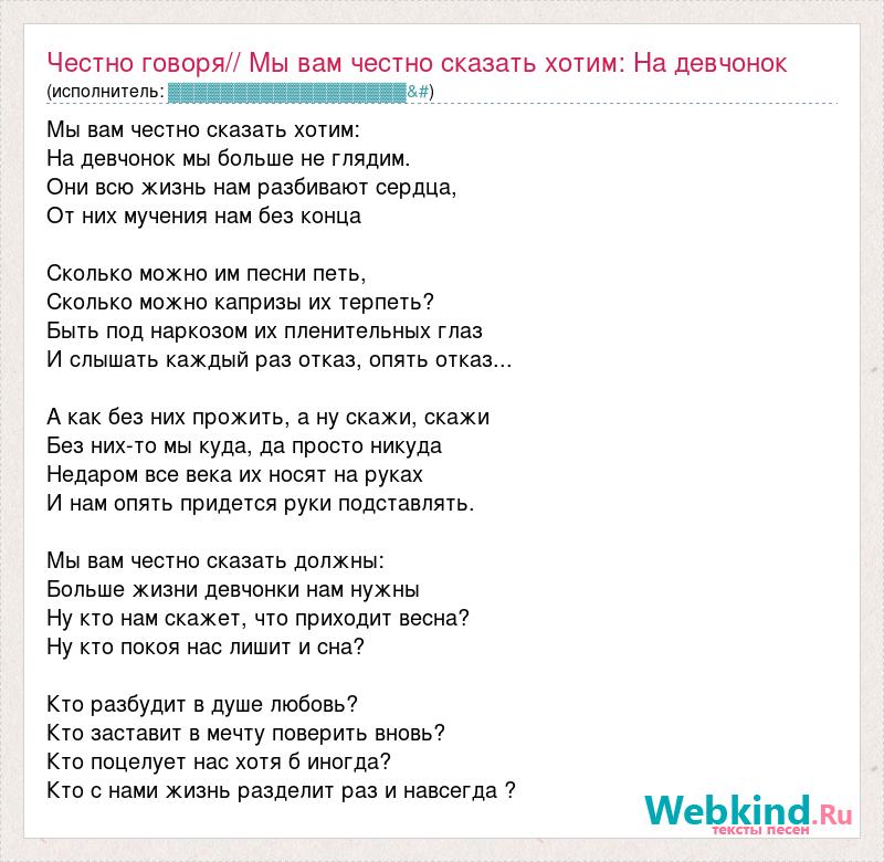 Мы вам честно сказать хотим: На девчонок мы больше не глядим. Они всю жизнь нам разбивают сердца, От них мучения нам без конца Сколько можно им песни петь, Сколько можно капризы их терпеть? Быть под наркозом их пленительных глаз И слышать каждый раз отказ, опять отказ... А как без них прожить, а ну скажи, скажи Без них-то мы куда, да просто никуда Недаром все века их носят на руках И нам опять придется руки подставлять. Мы вам честно сказать должны: Больше жизни девчонки нам нужны Ну кто нам скажет, что приходит весна? Ну кто покоя нас лишит и сна? Кто разбудит в душе любовь? Кто заставит в мечту поверить вновь? Кто поцелует нас хотя б иногда? Кто с нами жизнь разделит раз и навсегда ?