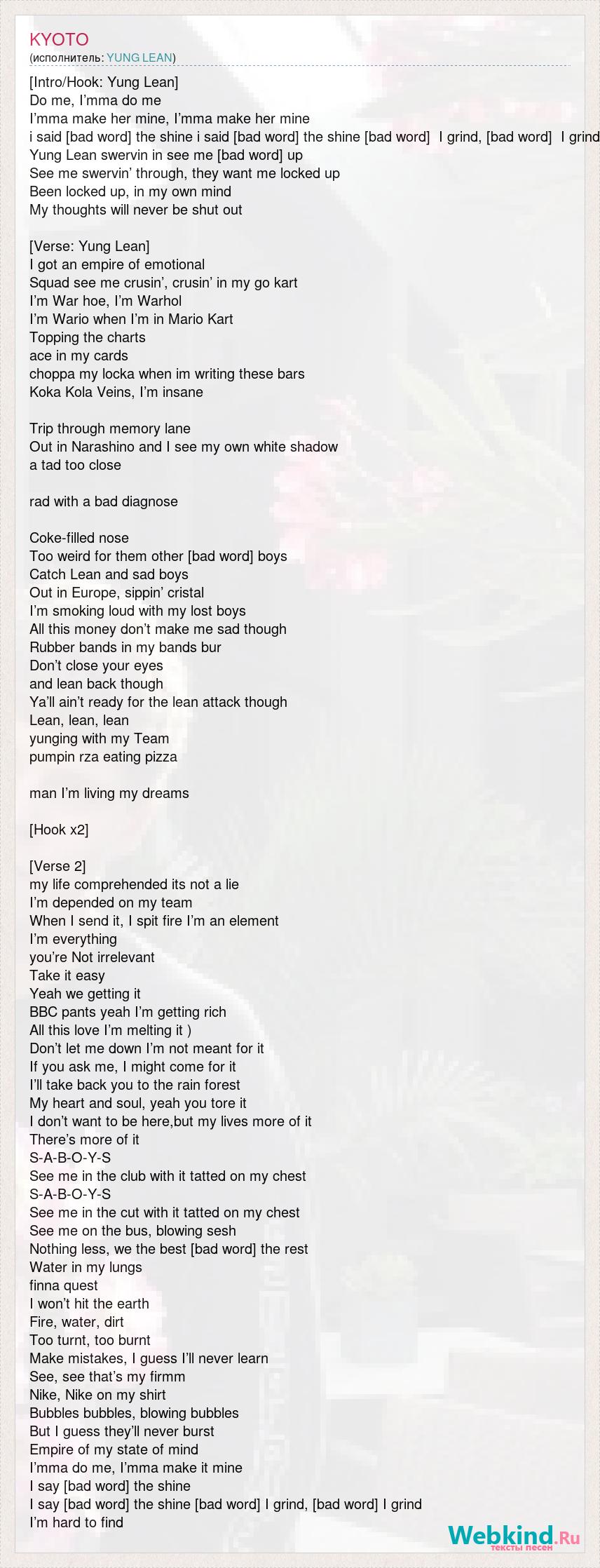[Intro/Hook: Yung Lean] Do me, I’mma do me I’mma make her mine, I’mma make her mine i said [bad word] the shine i said [bad word] the shine [bad word] I grind, [bad word] I grind Yung Lean swervin in see me [bad word] up See me swervin’ through, they want me locked up Been locked up, in my own mind My thoughts will never be shut out [Verse: Yung Lean] I got an empire of emotional Squad see me crusin’, crusin’ in my go kart I’m War hoe, I’m Warhol I’m Wario when I’m in Mario Kart Topping the charts ace in my cards choppa my locka when im writing these bars Koka Kola Veins, I’m insane Trip through memory lane Out in Narashino and I see my own white shadow a tad too close rad with a bad diagnose Coke-filled nose Too weird for them other [bad word] boys Catch Lean and sad boys Out in Europe, sippin’ cristal I’m smoking loud with my lost boys All this money don’t make me sad though Rubber bands in my bands bur Don’t close your eyes and lean back though Ya’ll ain’t ready for the lean attack though Lean, lean, lean yunging with my Team pumpin rza eating pizza man I’m living my dreams [Hook x2] [Verse 2] my life comprehended its not a lie I’m depended on my team When I send it, I spit fire I’m an element I’m everything you’re Not irrelevant Take it easy Yeah we getting it BBC pants yeah I’m getting rich All this love I’m melting it ) Don’t let me down I’m not meant for it If you ask me, I might come for it I’ll take back you to the rain forest My heart and soul, yeah you tore it I don’t want to be here,but my lives more of it There’s more of it S-A-B-O-Y-S See me in the club with it tatted on my chest S-A-B-O-Y-S See me in the cut with it tatted on my chest See me on the bus, blowing sesh Nothing less, we the best [bad word] the rest Water in my lungs finna quest I won’t hit the earth Fire, water, dirt Too turnt, too burnt Make mistakes, I guess I’ll never learn See, see that’s my firmm Nike, Nike on my shirt Bubbles bubbles, blowing bubbles But I guess they’ll never burst Empire of my state of mind I’mma do me, I’mma make it mine I say [bad word] the shine I say [bad word] the shine [bad word] I grind, [bad word] I grind I’m hard to find
