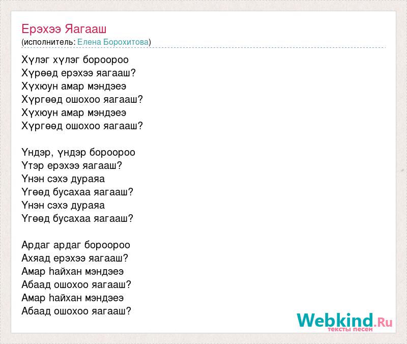 Хүлэг хүлэг бороороо Хүрөөд ерэхээ яагааш? Хүхюун амар мэндэеэ Хүргөөд ошохоо яагааш? Хүхюун амар мэндэеэ Хүргөөд ошохоо яагааш? Үндэр, үндэр бороороо Үтэр ерэхээ яагааш? Үнэн сэхэ дураяа Үгөөд бусахаа яагааш? Үнэн сэхэ дураяа Үгөөд бусахаа яагааш? Ардаг ардаг бороороо Ахяад ерэхээ яагааш? Амар hайхан мэндэеэ Абаад ошохоо яагааш? Амар hайхан мэндэеэ Абаад ошохоо яагааш?