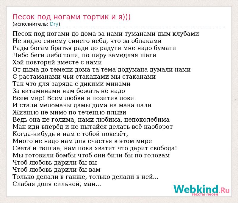 Песок под ногами до дома за нами туманами дым клубами Не видно синему синего неба, что за облаками Рады богам братья ради до радуги мне надо бумаги Либо беги либо топи, по пиру замедляя шаги Хэй повторяй вместе с нами От дыма до темени дома та тема додумана думали нами С растаманами чьи стаканами мы стаканами Так что для заряда с дикими минами За витаминами нам бежать не надо Всем мир! Всем любви и позитив лови И стали меломаны дамы дома на мана пали Жизнью не мимо по теченью плыви Ведь она не голима, нами любима, непоколебима Ман иди вперёд и не пытайся делать всё наоборот Когда-нибудь и нам с тобой повезёт, Много не надо нам для счастья в этом мире Света и теплаа, нам пока хватит что дарит свобода! Мы готовили бомбы чтоб они били бы по головам Чтоб любовь дарили бы вы Чтоб любовь дарили бы вам Только делали в ганже, только делали в ней... Слабая доля сильней, ман...