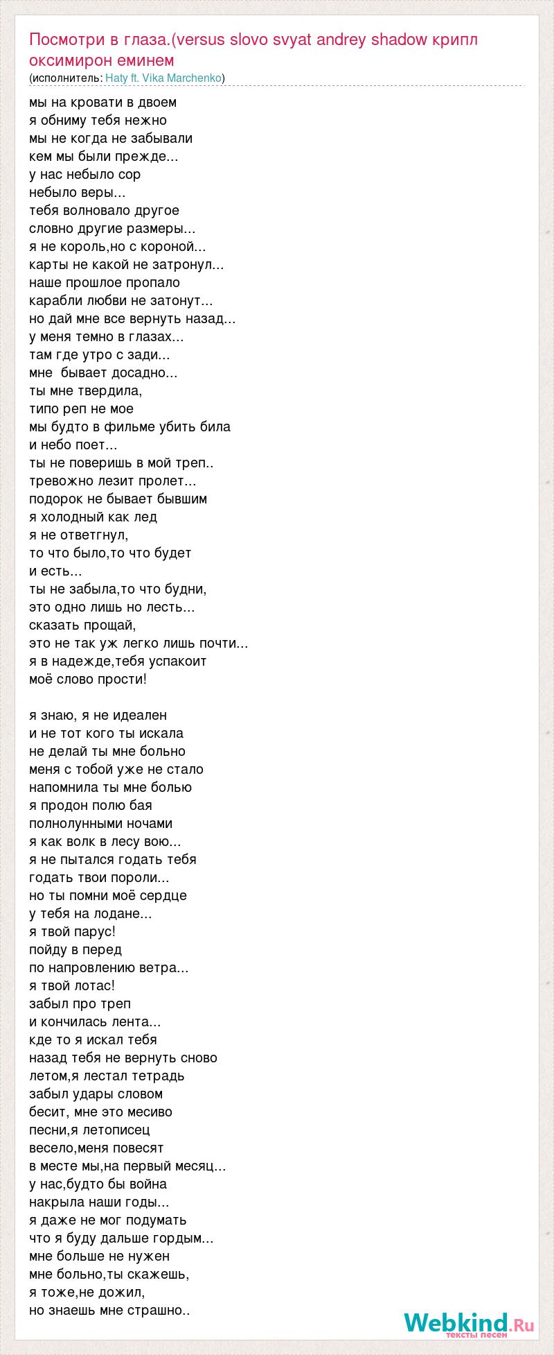 Главная→Исполнители→Haty ft. Vika Marchenko→Посмотри в глаза.(versus slovo svyat andrey shadow крипл оксимирон еминем с