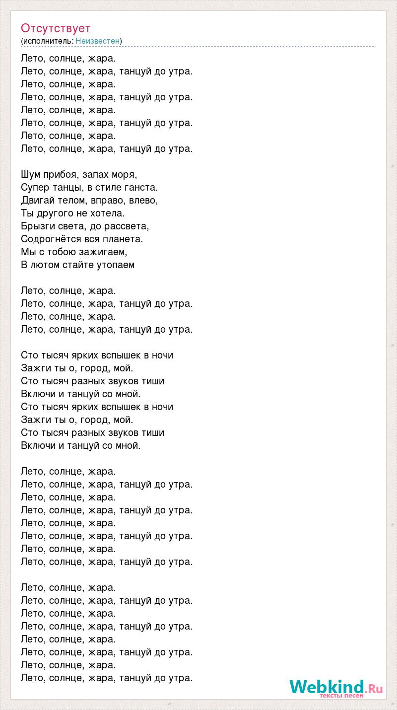 Лето, солнце, жара. Лето, солнце, жара, танцуй до утра. Лето, солнце, жара. Лето, солнце, жара, танцуй до утра. Лето, солнце, жара. Лето, солнце, жара, танцуй до утра. Лето, солнце, жара. Лето, солнце, жара, танцуй до утра. Шум прибоя, запах моря, Супер танцы, в стиле ганста. Двигай телом, вправо, влево, Ты другого не хотела. Брызги света, до рассвета, Содрогнётся вся планета. Мы с тобою зажигаем, В лютом стайте утопаем Лето, солнце, жара. Лето, солнце, жара, танцуй до утра. Лето, солнце, жара. Лето, солнце, жара, танцуй до утра. Сто тысяч ярких вспышек в ночи Зажги ты о, город, мой. Сто тысяч разных звуков тиши Включи и танцуй со мной. Сто тысяч ярких вспышек в ночи Зажги ты о, город, мой. Сто тысяч разных звуков тиши Включи и танцуй со мной. Лето, солнце, жара. Лето, солнце, жара, танцуй до утра. Лето, солнце, жара. Лето, солнце, жара, танцуй до утра. Лето, солнце, жара. Лето, солнце, жара, танцуй до утра. Лето, солнце, жара. Лето, солнце, жара, танцуй до утра. Лето, солнце, жара. Лето, солнце, жара, танцуй до утра. Лето, солнце, жара. Лето, солнце, жара, танцуй до утра. Лето, солнце, жара. Лето, солнце, жара, танцуй до утра. Лето, солнце, жара. Лето, солнце, жара, танцуй до утра.