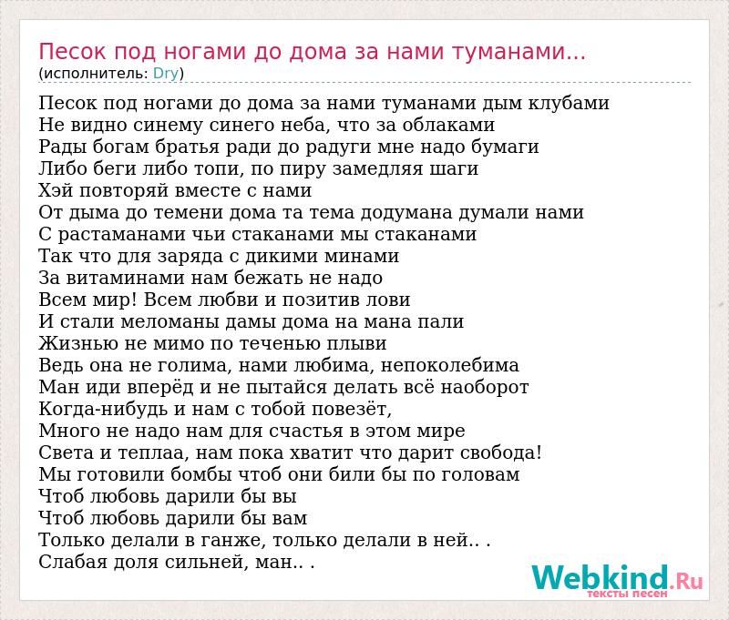 Песок под ногами до дома за нами туманами дым клубами Не видно синему синего неба, что за облаками Рады богам братья ради до радуги мне надо бумаги Либо беги либо топи, по пиру замедляя шаги Хэй повторяй вместе с нами От дыма до темени дома та тема додумана думали нами С растаманами чьи стаканами мы стаканами Так что для заряда с дикими минами За витаминами нам бежать не надо Всем мир! Всем любви и позитив лови И стали меломаны дамы дома на мана пали Жизнью не мимо по теченью плыви Ведь она не голима, нами любима, непоколебима Ман иди вперёд и не пытайся делать всё наоборот Когда-нибудь и нам с тобой повезёт, Много не надо нам для счастья в этом мире Света и теплаа, нам пока хватит что дарит свобода! Мы готовили бомбы чтоб они били бы по головам Чтоб любовь дарили бы вы Чтоб любовь дарили бы вам Только делали в ганже, только делали в ней.. . Слабая доля сильней, ман.. .