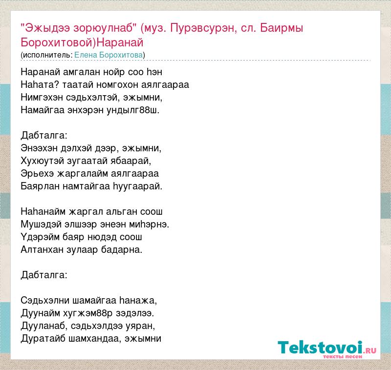 Наранай амгалан нойр соо hэн Наhата? таатай номгохон аялгаараа Нимгэхэн сэдьхэлтэй, эжымни, Намайгаа энхэрэн ундылг88ш. Дабталга: Энээхэн дэлхэй дээр, эжымни, Хухюутэй зугаатай ябаарай, Эрьехэ жаргалайм аялгаараа Баярлан намтайгаа hуугаарай. Наhанайм жаргал альган соош Мушэдэй элшээр энеэн миhэрнэ. Yдэрэйм баяр нюдэд соош Алтанхан зулаар бадарна. Дабталга: Сэдьхэлни шамайгаа hанажа, Дуунайм хугжэм88р зэдэлээ. Дууланаб, сэдьхэлдээ уяран, Дуратайб шамхандаа, эжымни