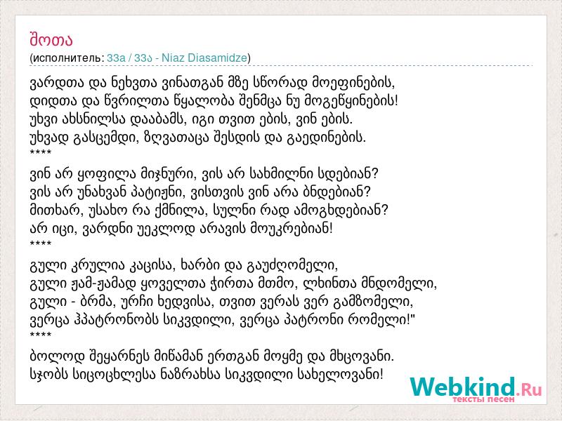 ვარდთა და ნეხვთა ვინათგან მზე სწორად მოეფინების, დიდთა და წვრილთა წყალობა შენმცა ნუ მოგეწყინების! უხვი ახსნილსა დააბამს, იგი თვით ების, ვინ ების. უხვად გასცემდი, ზღვათაცა შესდის და გაედინების. **** ვინ არ ყოფილა მიჯნური, ვის არ სახმილნი სდებიან? ვის არ უნახვან პატიჟნი, ვისთვის ვინ არა ბნდებიან? მითხარ, უსახო რა ქმნილა, სულნი რად ამოგხდებიან? არ იცი, ვარდნი უეკლოდ არავის მოუკრებიან! **** გული კრულია კაცისა, ხარბი და გაუძღომელი, გული ჟამ-ჟამად ყოველთა ჭირთა მთმო, ლხინთა მნდომელი, გული - ბრმა, ურჩი ხედვისა, თვით ვერას ვერ გამზომელი, ვერცა ჰპატრონობს სიკვდილი, ვერცა პატრონი რომელი!" **** ბოლოდ შეყარნეს მიწამან ერთგან მოყმე და მხცოვანი. სჯობს სიცოცხლესა ნაზრახსა სიკვდილი სახელოვანი!