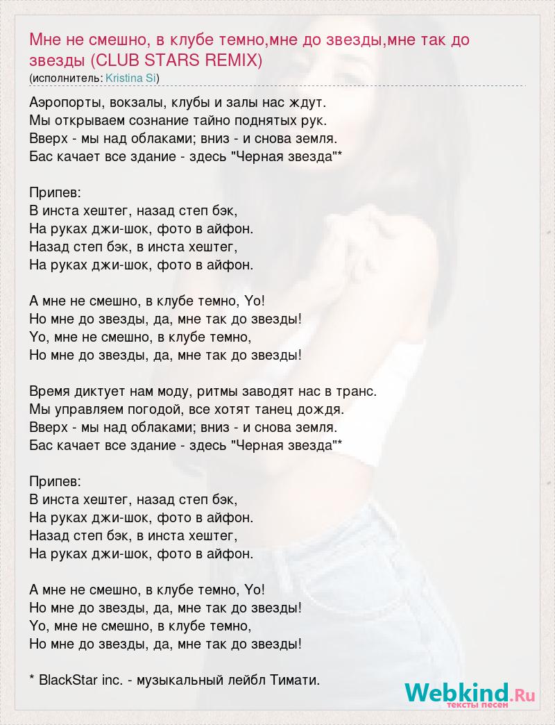 Аэропорты, вокзалы, клубы и залы нас ждут. Мы открываем сознание тайно поднятых рук. Вверх - мы над облаками; вниз - и снова земля. Бас качает все здание - здесь "Черная звезда"* Припев: В инста хештег, назад степ бэк, На руках джи-шок, фото в айфон. Назад степ бэк, в инста хештег, На руках джи-шок, фото в айфон. А мне не смешно, в клубе темно, Yo! Но мне до звезды, да, мне так до звезды! Yo, мне не смешно, в клубе темно, Но мне до звезды, да, мне так до звезды! Время диктует нам моду, ритмы заводят нас в транс. Мы управляем погодой, все хотят танец дождя. Вверх - мы над облаками; вниз - и снова земля. Бас качает все здание - здесь "Черная звезда"* Припев: В инста хештег, назад степ бэк, На руках джи-шок, фото в айфон. Назад степ бэк, в инста хештег, На руках джи-шок, фото в айфон. А мне не смешно, в клубе темно, Yo! Но мне до звезды, да, мне так до звезды! Yo, мне не смешно, в клубе темно, Но мне до звезды, да, мне так до звезды! * BlackStar inc. - музыкальный лейбл Тимати.