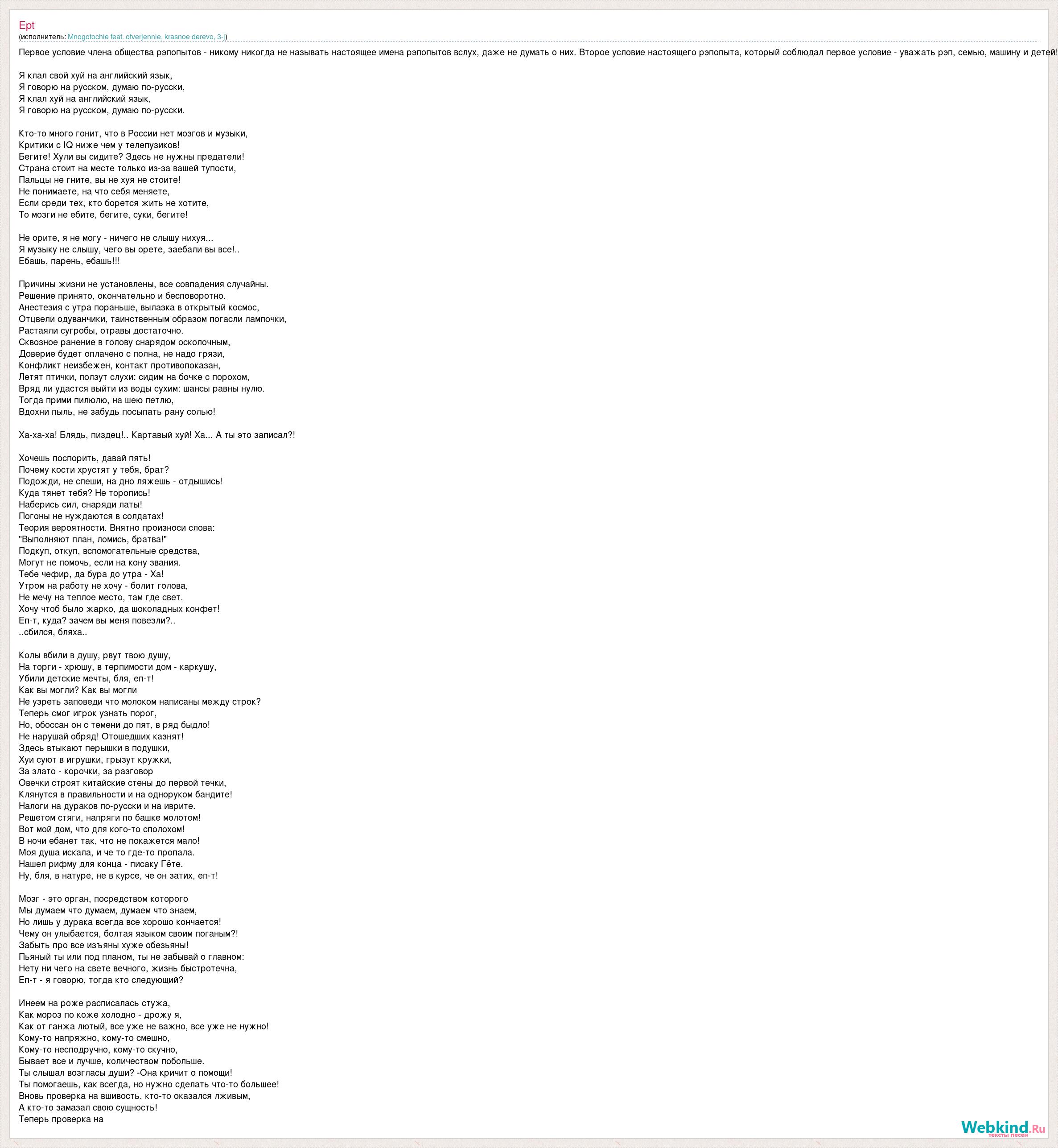 Первое условие члена общества рэпопытов - никому никогда не называть настоящее имена рэпопытов вслух, даже не думать о них. Второе условие настоящего рэпопыта, который соблюдал первое условие - уважать рэп, семью, машину и детей! Я клал свой хуй на английский язык, Я говорю на русском, думаю по-русски, Я клал хуй на английский язык, Я говорю на русском, думаю по-русски. Кто-то много гонит, что в России нет мозгов и музыки, Критики с IQ ниже чем у телепузиков! Бегите! Хули вы сидите? Здесь не нужны предатели! Страна стоит на месте только из-за вашей тупости, Пальцы не гните, вы не хуя не стоите! Не понимаете, на что себя меняете, Если среди тех, кто борется жить не хотите, То мозги не ебите, бегите, суки, бегите! Не орите, я не могу - ничего не слышу нихуя... Я музыку не слышу, чего вы орете, заебали вы все!.. Ебашь, парень, ебашь!!! Причины жизни не установлены, все совпадения случайны. Решение принято, окончательно и бесповоротно. Анестезия с утра пораньше, вылазка в открытый космос, Отцвели одуванчики, таинственным образом погасли лампочки, Растаяли сугробы, отравы достаточно. Сквозное ранение в голову снарядом осколочным, Доверие будет оплачено с полна, не надо грязи, Конфликт неизбежен, контакт противопоказан, Летят птички, ползут слухи: сидим на бочке с порохом, Вряд ли удастся выйти из воды сухим: шансы равны нулю. Тогда прими пилюлю, на шею петлю, Вдохни пыль, не забудь посыпать рану солью! Ха-ха-ха! Блядь, пиздец!.. Картавый хуй! Ха... А ты это записал?! Хочешь поспорить, давай пять! Почему кости хрустят у тебя, брат? Подожди, не спеши, на дно ляжешь - отдышись! Куда тянет тебя? Не торопись! Наберись сил, снаряди латы! Погоны не нуждаются в солдатах! Теория вероятности. Внятно произноси слова: "Выполняют план, ломись, братва!" Подкуп, откуп, вспомогательные средства, Могут не помочь, если на кону звания. Тебе чефир, да бура до утра - Ха! Утром на работу не хочу - болит голова, Не мечу на теплое место, там где свет. Хочу чтоб было жарко, да шоколадных конфет! Еп-т, куда? зачем вы меня повезли?.. ..сбился, бляха.. Колы вбили в душу, рвут твою душу, На торги - хрюшу, в терпимости дом - каркушу, Убили детские мечты, бля, еп-т! Как вы могли? Как вы могли Не узреть заповеди что молоком написаны между строк? Теперь смог игрок узнать порог, Но, обоссан он с темени до пят, в ряд быдло! Не нарушай обряд! Отошедших казнят! Здесь втыкают перышки в подушки, Хуи суют в игрушки, грызут кружки, За злато - корочки, за разговор Овечки строят китайские стены до первой течки, Клянутся в правильности и на одноруком бандите! Налоги на дураков по-русски и на иврите. Решетом стяги, напряги по башке молотом! Вот мой дом, что для кого-то сполохом! В ночи ебанет так, что не покажется мало! Моя душа искала, и че то где-то пропала. Нашел рифму для конца - писаку Гёте. Ну, бля, в натуре, не в курсе, че он затих, еп-т! Мозг - это орган, посредством которого Мы думаем что думаем, думаем что знаем, Но лишь у дурака всегда все хорошо кончается! Чему он улыбается, болтая языком своим поганым?! Забыть про все изъяны хуже обезьяны! Пьяный ты или под планом, ты не забывай о главном: Нету ни чего на свете вечного, жизнь быстротечна, Еп-т - я говорю, тогда кто следующий? Инеем на роже расписалась стужа, Как мороз по коже холодно - дрожу я, Как от ганжа лютый, все уже не важно, все уже не нужно! Кому-то напряжно, кому-то смешно, Кому-то несподручно, ком