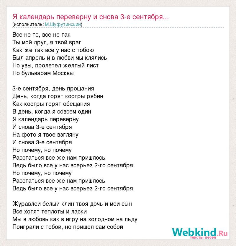 Все не то, все не так Ты мой друг, я твой враг Как же так все у нас с тобою Был апрель и в любви мы клялись Но увы, пролетел желтый лист По бульварам Москвы 3-е сентября, день прощания День, когда горят костры рябин Как костры горят обещания В день, когда я совсем один Я календарь переверну И снова 3-е сентября На фото я твое взгляну И снова 3-е сентября Но почему, но почему Расстаться все же нам пришлось Ведь было все у нас всерьез 2-го сентября Но почему, но почему Расстаться все же нам пришлось Ведь было все у нас всерьез 2-го сентября Журавлей белый клин твоя дочь и мой сын Все хотят теплоты и ласки Мы в любовь как в игру на холодном на льду Поиграли с тобой, но пришел сам собой