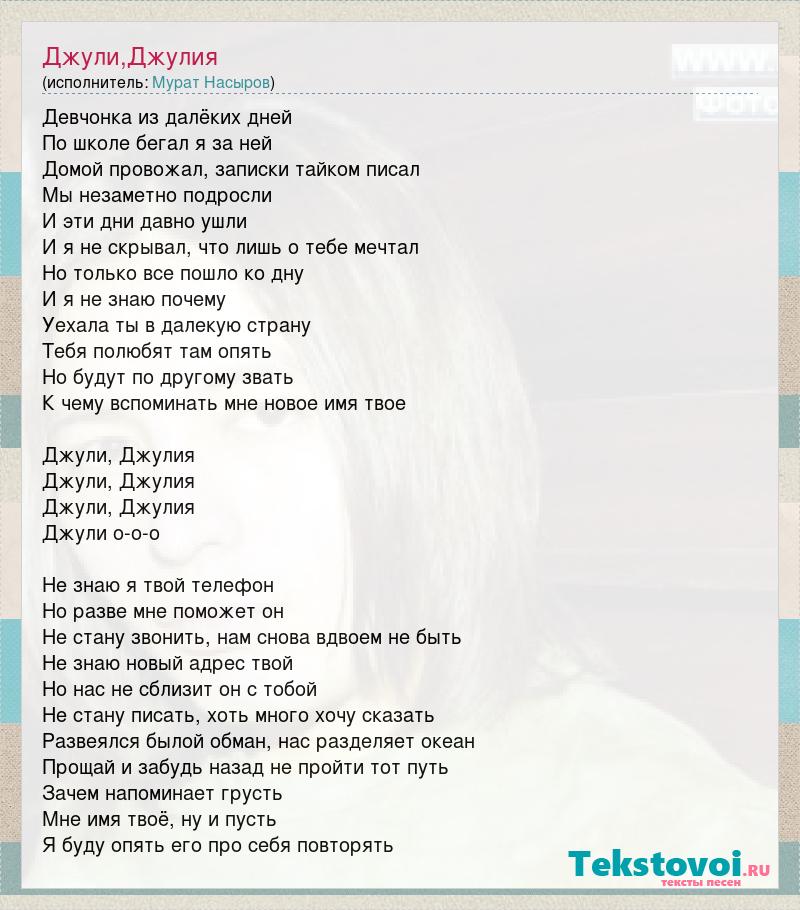 Девчонка из далёких дней По школе бегал я за ней Домой провожал, записки тайком писал Мы незаметно подросли И эти дни давно ушли И я не скрывал, что лишь о тебе мечтал Но только все пошло ко дну И я не знаю почему Уехала ты в далекую страну Тебя полюбят там опять Но будут по другому звать К чему вспоминать мне новое имя твое Джули, Джулия Джули, Джулия Джули, Джулия Джули о-о-о Не знаю я твой телефон Но разве мне поможет он Не стану звонить, нам снова вдвоем не быть Не знаю новый адрес твой Но нас не сблизит он с тобой Не стану писать, хоть много хочу сказать Развеялся былой обман, нас разделяет океан Прощай и забудь назад не пройти тот путь Зачем напоминает грусть Мне имя твоё, ну и пусть Я буду опять его про себя повторять