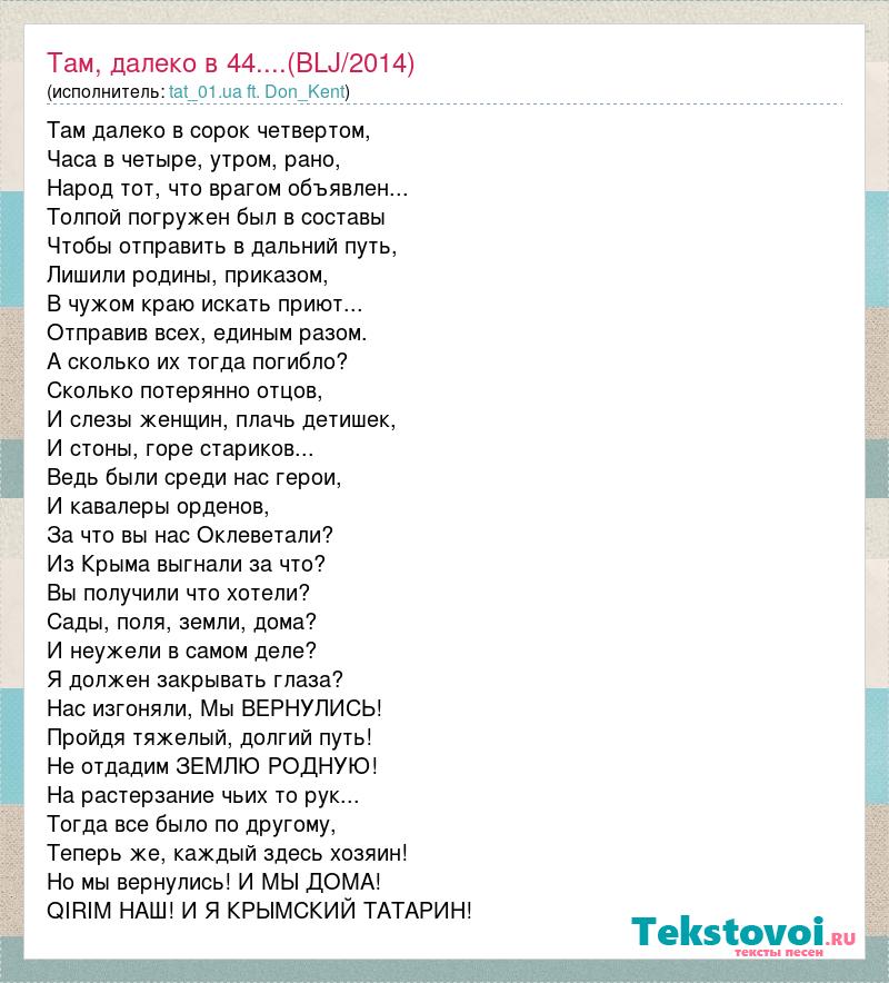 Там далеко в сорок четвертом, Часа в четыре, утром, рано, Народ тот, что врагом объявлен... Толпой погружен был в составы Чтобы отправить в дальний путь, Лишили родины, приказом, В чужом краю искать приют... Отправив всех, единым разом. А сколько их тогда погибло? Сколько потерянно отцов, И слезы женщин, плачь детишек, И стоны, горе стариков... Ведь были среди нас герои, И кавалеры орденов, За что вы нас Оклеветали? Из Крыма выгнали за что? Вы получили что хотели? Сады, поля, земли, дома? И неужели в самом деле? Я должен закрывать глаза? Нас изгоняли, Мы ВЕРНУЛИСЬ! Пройдя тяжелый, долгий путь! Не отдадим ЗЕМЛЮ РОДНУЮ! На растерзание чьих то рук... Тогда все было по другому, Теперь же, каждый здесь хозяин! Но мы вернулись! И МЫ ДОМА! QIRIM НАШ! И Я КРЫМСКИЙ ТАТАРИН!