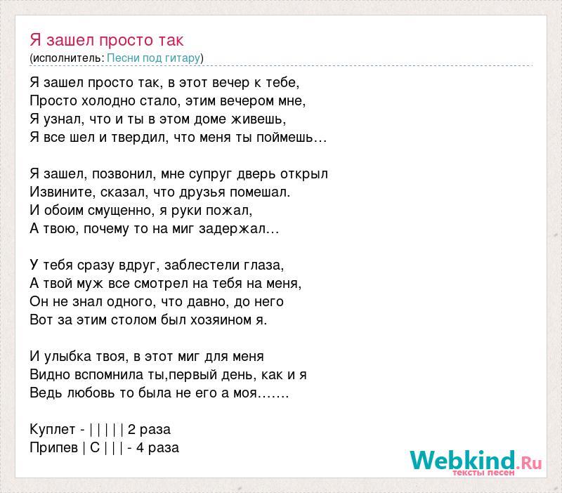 Я зашел просто так, в этот вечер к тебе, Просто холодно стало, этим вечером мне, Я узнал, что и ты в этом доме живешь, Я все шел и твердил, что меня ты поймешь… Я зашел, позвонил, мне супруг дверь открыл Извините, сказал, что друзья помешал. И обоим смущенно, я руки пожал, А твою, почему то на миг задержал… У тебя сразу вдруг, заблестели глаза, А твой муж все смотрел на тебя на меня, Он не знал одного, что давно, до него Вот за этим столом был хозяином я. И улыбка твоя, в этот миг для меня Видно вспомнила ты,первый день, как и я Ведь любовь то была не его а моя……. Куплет - | | | | | 2 раза Припев | С | | | - 4 раза