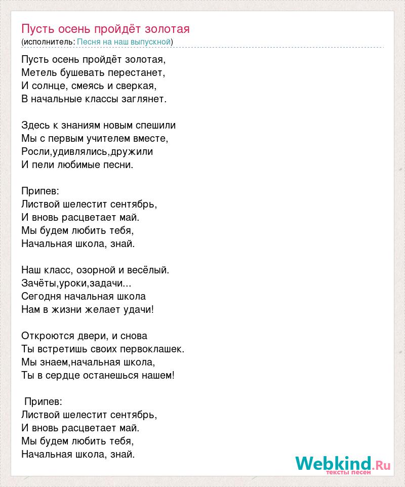 Пусть осень пройдёт золотая, Метель бушевать перестанет, И солнце, смеясь и сверкая, В начальные классы заглянет. Здесь к знаниям новым спешили Мы с первым учителем вместе, Росли,удивлялись,дружили И пели любимые песни. Припев: Листвой шелестит сентябрь, И вновь расцветает май. Мы будем любить тебя, Начальная школа, знай. Наш класс, озорной и весёлый. Зачёты,уроки,задачи... Сегодня начальная школа Нам в жизни желает удачи! Откроются двери, и снова Ты встретишь своих первоклашек. Мы знаем,начальная школа, Ты в сердце останешься нашем! Припев: Листвой шелестит сентябрь, И вновь расцветает май. Мы будем любить тебя, Начальная школа, знай.