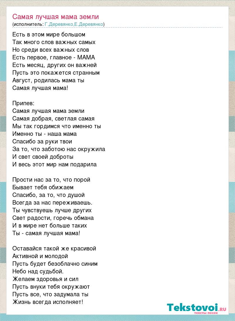 Есть в этом мире большом Так много слов важных самых Но среди всех важных слов Есть первое, главное - МАМА Есть месяц, других он важней Пусть это покажется странным Август, родилась мама ты Самая лучшая мама! Припев: Самая лучшая мама земли Самая добрая, светлая самая Мы так гордимся что именно ты Именно ты - наша мама Спасибо за руки твои За то, что заботою нас окружила И свет своей доброты И весь этот мир нам подарила Прости нас за то, что порой Бывает тебя обижаем Спасибо, за то, что душой Всегда за нас переживаешь. Ты чувствуешь лучше других Свет радости, горечь обмана И в мире нет больше таких Ты - самая лучшая мама! Оставайся такой же красивой Активной и молодой Пусть будет безоблачно синим Небо над судьбой. Желаем здоровья и сил Пусть внуки тебя окружают Пусть все, что задумала ты Жизнь всегда исполняет!