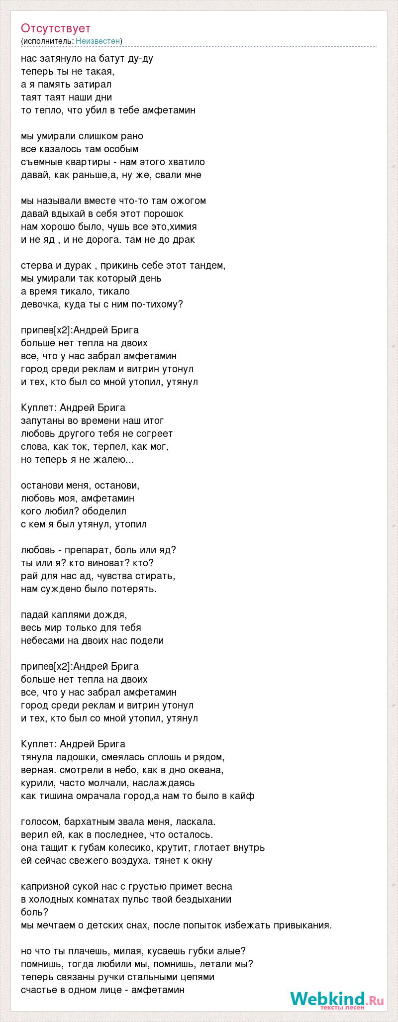 нас затянуло на батут ду-ду теперь ты не такая, а я память затирал таят таят наши дни то тепло, что убил в тебе амфетамин мы умирали слишком рано все казалось там особым съемные квартиры - нам этого хватило давай, как раньше,а, ну же, свали мне мы называли вместе что-то там ожогом давай вдыхай в себя этот порошок нам хорошо было, чушь все это,химия и не яд , и не дорога. там не до драк стерва и дурак , прикинь себе этот тандем, мы умирали так который день а время тикало, тикало девочка, куда ты с ним по-тихому? припев[х2]:Андрей Брига больше нет тепла на двоих все, что у нас забрал амфетамин город среди реклам и витрин утонул и тех, кто был со мной утопил, утянул Куплет: Андрей Брига запутаны во времени наш итог любовь другого тебя не согреет слова, как ток, терпел, как мог, но теперь я не жалею... останови меня, останови, любовь моя, амфетамин кого любил? ободелил с кем я был утянул, утопил любовь - препарат, боль или яд? ты или я? кто виноват? кто? рай для нас ад, чувства стирать, нам суждено было потерять. падай каплями дождя, весь мир только для тебя небесами на двоих нас подели припев[х2]:Андрей Брига больше нет тепла на двоих все, что у нас забрал амфетамин город среди реклам и витрин утонул и тех, кто был со мной утопил, утянул Куплет: Андрей Брига тянула ладошки, смеялась сплошь и рядом, верная. смотрели в небо, как в дно океана, курили, часто молчали, наслаждаясь как тишина омрачала город,а нам то было в кайф голосом, бархатным звала меня, ласкала. верил ей, как в последнее, что осталось. она тащит к губам колесико, крутит, глотает внутрь ей сейчас свежего воздуха. тянет к окну капризной сукой нас с грустью примет весна в холодных комнатах пульс твой бездыхании боль? мы мечтаем о детских снах, после попыток избежать привыкания. но что ты плачешь, милая, кусаешь губки алые? помнишь, тогда любили мы, помнишь, летали мы? теперь связаны ручки стальными цепями счастье в одном лице - амфетамин