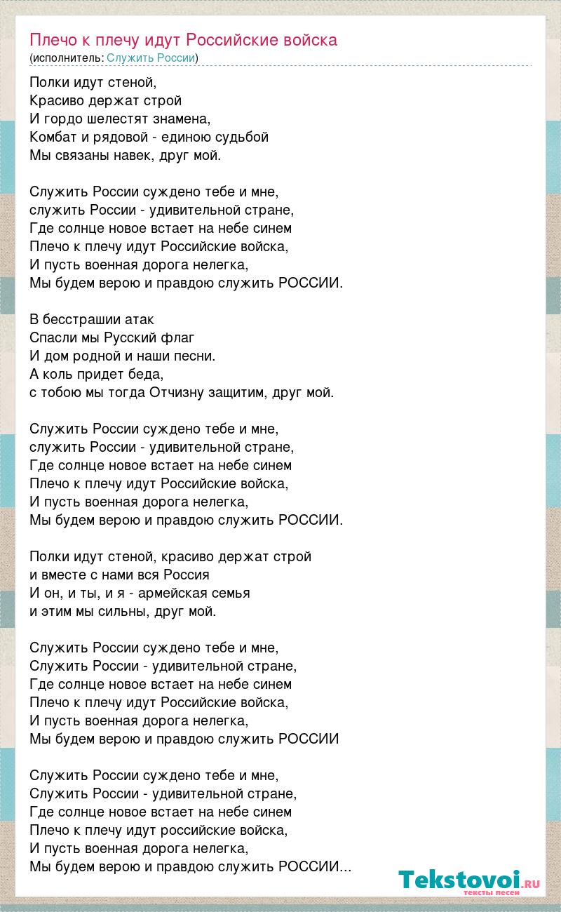 Полки идут стеной, Красиво держат строй И гордо шелестят знамена, Комбат и рядовой - единою судьбой Мы связаны навек, друг мой. Служить России суждено тебе и мне, служить России - удивительной стране, Где солнце новое встает на небе синем Плечо к плечу идут Российские войска, И пусть военная дорога нелегка, Мы будем верою и правдою служить РОССИИ. В бесстрашии атак Спасли мы Русский флаг И дом родной и наши песни. А коль придет беда, с тобою мы тогда Отчизну защитим, друг мой. Служить России суждено тебе и мне, служить России - удивительной стране, Где солнце новое встает на небе синем Плечо к плечу идут Российские войска, И пусть военная дорога нелегка, Мы будем верою и правдою служить РОССИИ. Полки идут стеной, красиво держат строй и вместе с нами вся Россия И он, и ты, и я - армейская семья и этим мы сильны, друг мой. Служить России суждено тебе и мне, Служить России - удивительной стране, Где солнце новое встает на небе синем Плечо к плечу идут Российские войска, И пусть военная дорога нелегка, Мы будем верою и правдою служить РОССИИ Служить России суждено тебе и мне, Служить России - удивительной стране, Где солнце новое встает на небе синем Плечо к плечу идут российские войска, И пусть военная дорога нелегка, Мы будем верою и правдою служить РОССИИ...