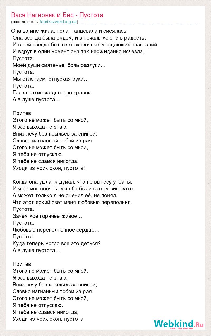 Она во мне жила, пела, танцевала и смеялась. Она всегда была рядом, и в печаль мою, и в радость. И в ней всегда был свет сказочных мерцающих созвездий. И вдруг в один момент она так неожиданно исчезла. Пустота Моей души смятенье, боль разлуки… Пустота. Мы отлетаем, отпуская руки… Пустота. Глаза такие жадные до красок. А в душе пустота… Припев Этого не может быть со мной, Я же выхода не знаю. Вниз лечу без крыльев за спиной, Словно изгнанный тобой из рая. Этого не может быть со мной, Я тебя не отпускаю. Я тебе не сдамся никогда, Уходи из моих окон, пустота! Когда она ушла, я думал, что не вынесу утраты. И я не мог понять, мы оба были в этом виноваты. А может только я не оценил её, не понял, Что этот яркий свет меня любовью переполнил. Пустота. Зачем моё горячее живое… Пустота. Любовью переполненное сердце… Пустота. Куда теперь могло все это деться? А в душе пустота… Припев Этого не может быть со мной, Я же выхода не знаю. Вниз лечу без крыльев за спиной, Словно изгнанный тобой из рая. Этого не может быть со мной, Я тебя не отпускаю. Я тебе не сдамся никогда, Уходи из моих окон, пустота