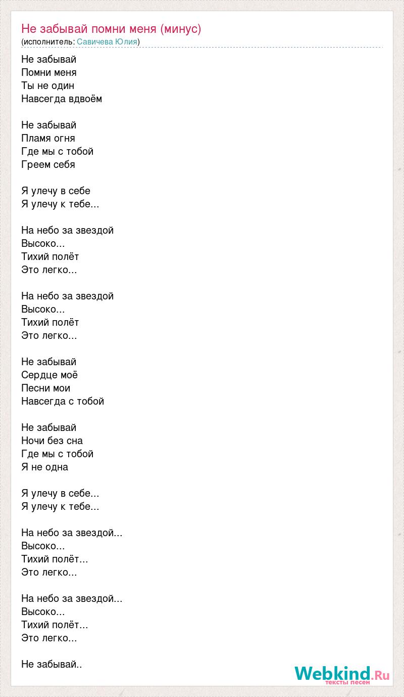 Не забывай Помни меня Ты не один Навсегда вдвоём Не забывай Пламя огня Где мы с тобой Греем себя Я улечу в себе Я улечу к тебе... На небо за звездой Высоко... Тихий полёт Это легко... На небо за звездой Высоко... Тихий полёт Это легко... Не забывай Сердце моё Песни мои Навсегда с тобой Не забывай Ночи без сна Где мы с тобой Я не одна Я улечу в себе... Я улечу к тебе... На небо за звездой... Высоко... Тихий полёт... Это легко... На небо за звездой... Высоко... Тихий полёт... Это легко... Не забывай..