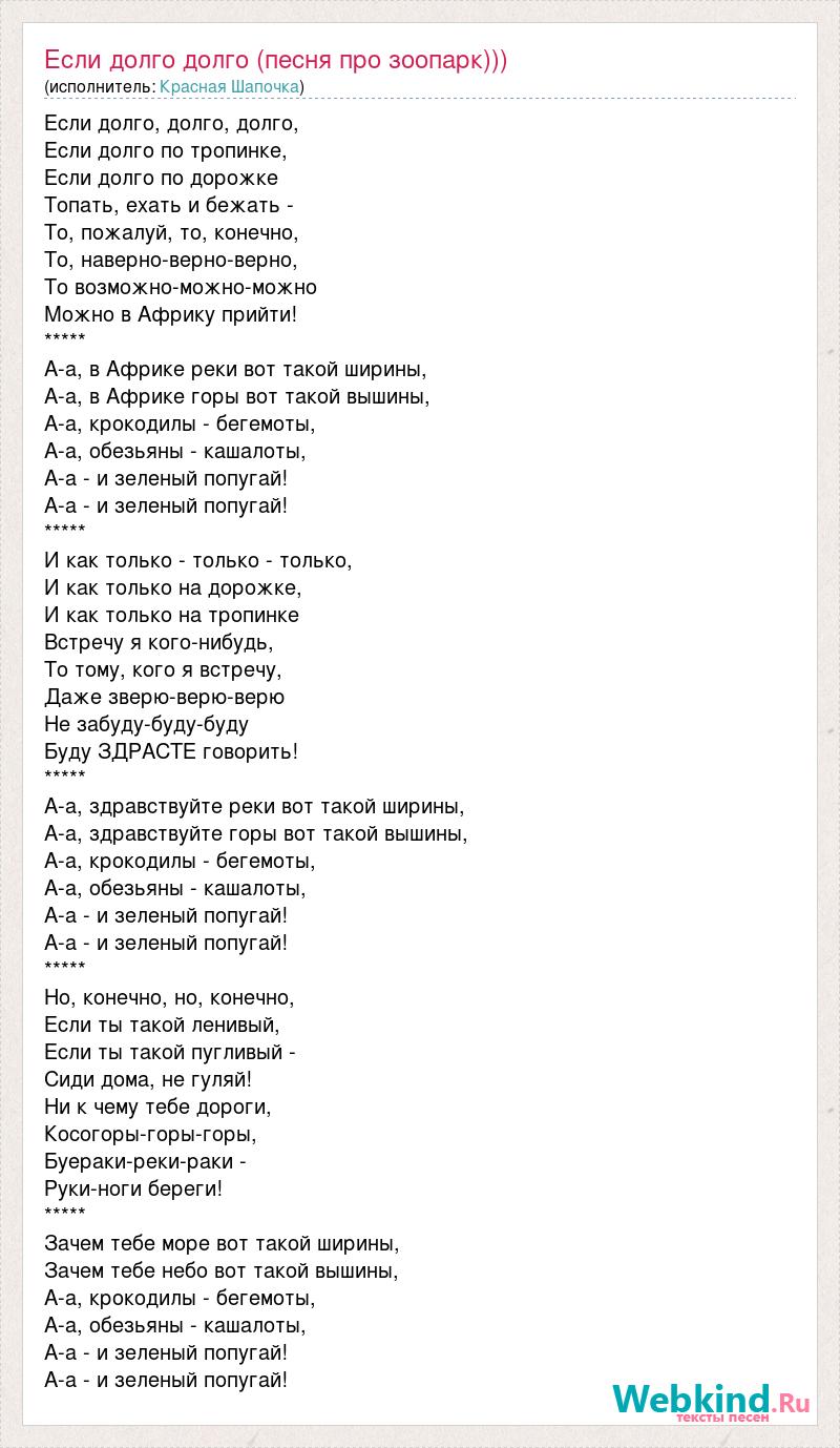 Если долго, долго, долго, Если долго по тропинке, Если долго по дорожке Топать, ехать и бежать - То, пожалуй, то, конечно, То, наверно-верно-верно, То возможно-можно-можно Можно в Африку прийти! ***** А-а, в Африке реки вот такой ширины, А-а, в Африке горы вот такой вышины, А-а, крокодилы - бегемоты, А-а, обезьяны - кашалоты, А-а - и зеленый попугай! А-а - и зеленый попугай! ***** И как только - только - только, И как только на дорожке, И как только на тропинке Встречу я кого-нибудь, То тому, кого я встречу, Даже зверю-верю-верю Не забуду-буду-буду Буду ЗДРАСТЕ говорить! ***** А-а, здравствуйте реки вот такой ширины, А-а, здравствуйте горы вот такой вышины, А-а, крокодилы - бегемоты, А-а, обезьяны - кашалоты, А-а - и зеленый попугай! А-а - и зеленый попугай! ***** Но, конечно, но, конечно, Если ты такой ленивый, Если ты такой пугливый - Сиди дома, не гуляй! Ни к чему тебе дороги, Косогоры-горы-горы, Буераки-реки-раки - Руки-ноги береги! ***** Зачем тебе море вот такой ширины, Зачем тебе небо вот такой вышины, А-а, крокодилы - бегемоты, А-а, обезьяны - кашалоты, А-а - и зеленый попугай! А-а - и зеленый попугай!