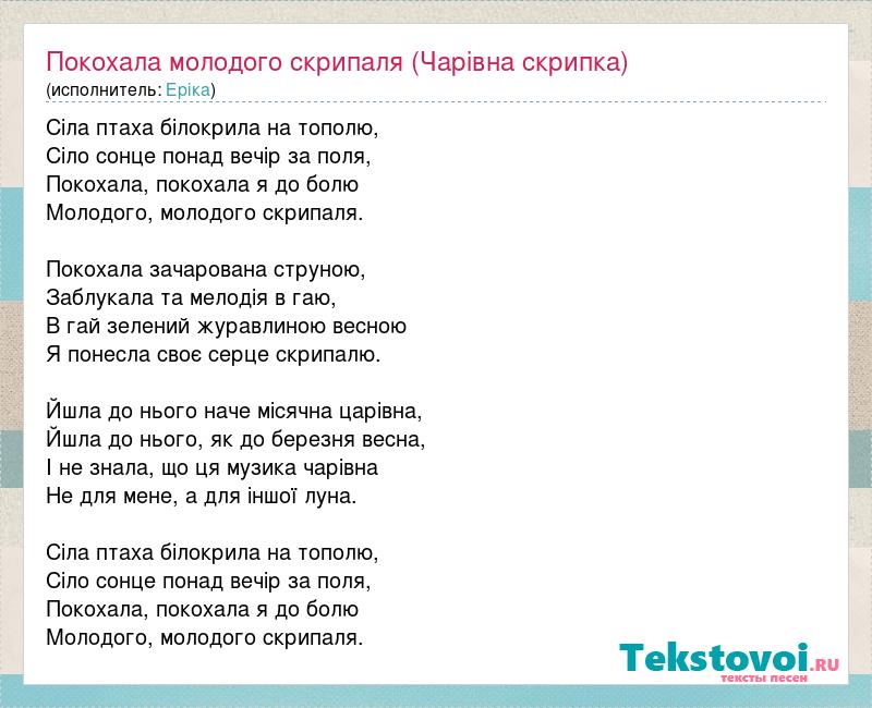 Сіла птаха білокрила на тополю, Сіло сонце понад вечір за поля, Покохала, покохала я до болю Молодого, молодого скрипаля. Покохала зачарована струною, Заблукала та мелодія в гаю, В гай зелений журавлиною весною Я понесла своє серце скрипалю. Йшла до нього наче місячна царівна, Йшла до нього, як до березня весна, І не знала, що ця музика чарівна Не для мене, а для іншої луна. Сіла птаха білокрила на тополю, Сіло сонце понад вечір за поля, Покохала, покохала я до болю Молодого, молодого скрипаля.