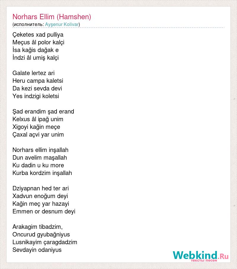 Çeketes xad pulliya Meçus âl polor kalçi İsa kağis dağak e İndzi âl umiş kalçi Galate lertez ari Heru campa kaletsi Da kezi sevda devi Yes indzigi koletsi Şad erandim şad erand Kelxus âl ipağ unim Xigoyi kağin meçe Çaxal açvi yar unim Norhars ellim inşallah Dun avelim maşallah Ku dadin u ku more Kurba kordzim inşallah Dziyapnan hed ter ari Xadvun enoğum deyi Kağin meç yar hazayi Emmen or desnum deyi Arakagim tibadzim, Oncurud gyubağniyus Lusnikayim çaragdadzim Sevdayin odaniyus