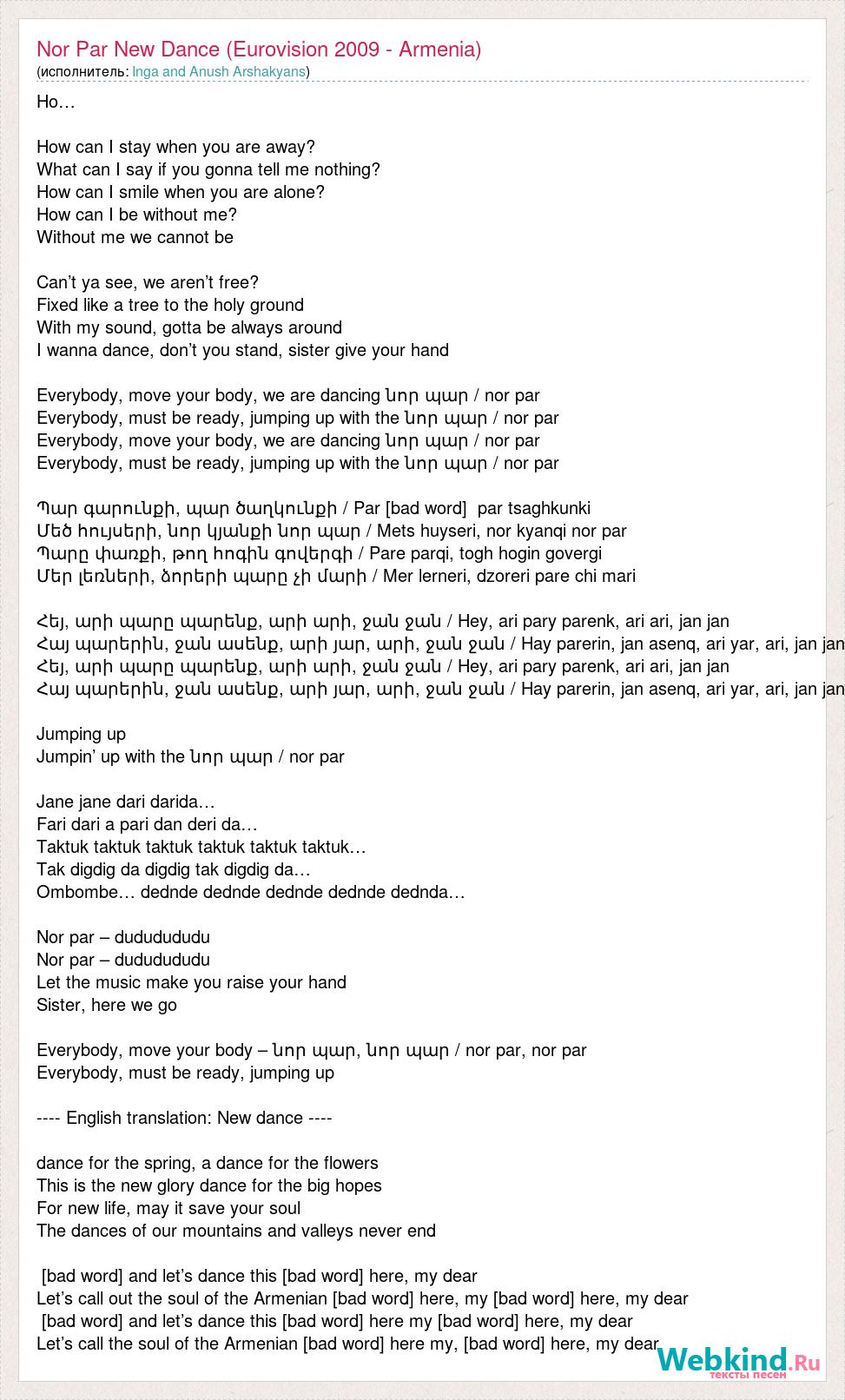 Ho… How can I stay when you are away? What can I say if you gonna tell me nothing? How can I smile when you are alone? How can I be without me? Without me we cannot be Can’t ya see, we aren’t free? Fixed like a tree to the holy ground With my sound, gotta be always around I wanna dance, don’t you stand, sister give your hand Everybody, move your body, we are dancing նոր պար / nor par Everybody, must be ready, jumping up with the նոր պար / nor par Everybody, move your body, we are dancing նոր պար / nor par Everybody, must be ready, jumping up with the նոր պար / nor par Պար գարունքի, պար ծաղկունքի / Par [bad word] par tsaghkunki Մեծ հույսերի, նոր կյանքի նոր պար / Mets huyseri, nor kyanqi nor par Պարը փառքի, թող հոգին գովերգի / Pare parqi, togh hogin govergi Մեր լեռների, ձորերի պարը չի մարի / Mer lerneri, dzoreri pare chi mari Հեյ, արի պարը պարենք, արի արի, ջան ջան / Hey, ari pary parenk, ari ari, jan jan Հայ պարերին, ջան ասենք, արի յար, արի, ջան ջան / Hay parerin, jan asenq, ari yar, ari, jan jan Հեյ, արի պարը պարենք, արի արի, ջան ջան / Hey, ari pary parenk, ari ari, jan jan Հայ պարերին, ջան ասենք, արի յար, արի, ջան ջան / Hay parerin, jan asenq, ari yar, ari, jan jan Jumping up Jumpin’ up with the նոր պար / nor par Jane jane dari darida… Fari dari a pari dan deri da… Taktuk taktuk taktuk taktuk taktuk taktuk… Tak digdig da digdig tak digdig da… Ombombe… dednde dednde dednde dednde dednda… Nor par – dududududu Nor par – dududududu Let the music make you raise your hand Sister, here we go Everybody, move your body – նոր պար, նոր պար / nor par, nor par Everybody, must be ready, jumping up ---- English translation: New dance ---- dance for the spring, a dance for the flowers This is the new glory dance for the big hopes For new life, may it save your soul The dances of our mountains and valleys never end [bad word] and let’s dance this [bad word] here, my dear Let’s call out the soul of the Armenian [bad word] here, my [bad word] here, my dear [bad word] and let’s dance this [bad word] here my [bad word] here, my dear Let’s call the soul of the Armenian [bad word] here my, [bad word] here, my dear