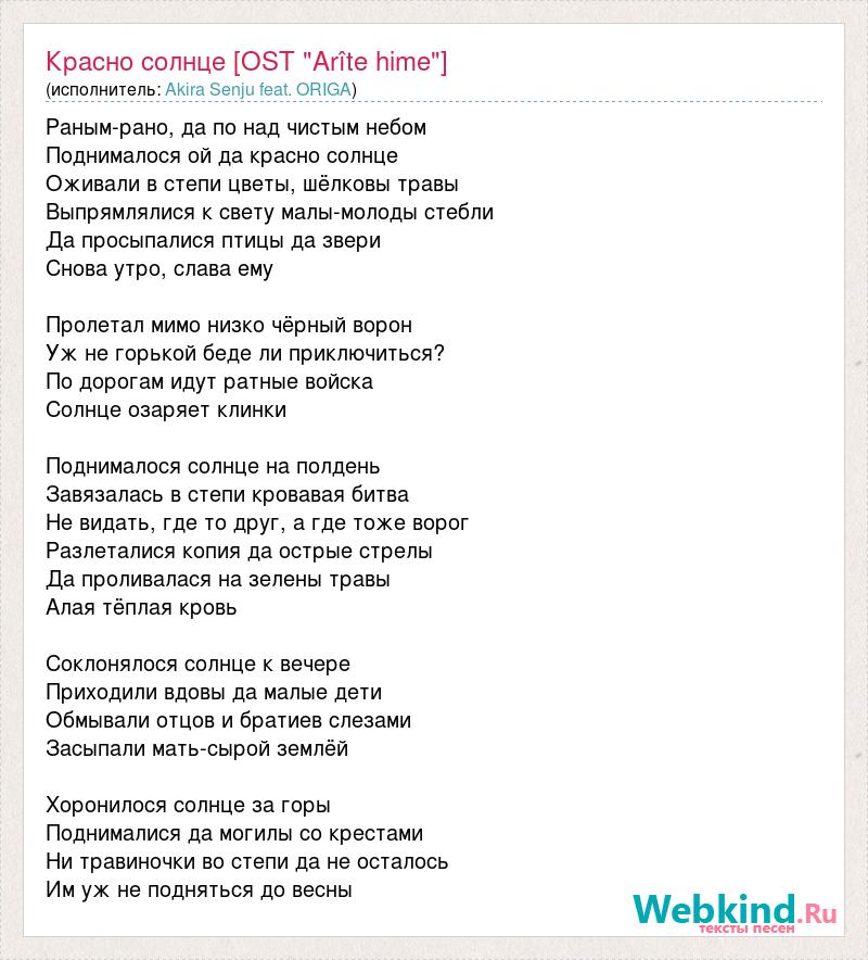 Раным-рано, да по над чистым небом Поднималося ой да красно солнце Оживали в степи цветы, шёлковы травы Выпрямлялися к свету малы-молоды стебли Да просыпалися птицы да звери Снова утро, слава ему Пролетал мимо низко чёрный ворон Уж не горькой беде ли приключиться? По дорогам идут ратные войска Солнце озаряет клинки Поднималося солнце на полдень Завязалась в степи кровавая битва Не видать, где то друг, а где тоже ворог Разлеталися копия да острые стрелы Да проливалася на зелены травы Алая тёплая кровь Соклонялося солнце к вечере Приходили вдовы да малые дети Обмывали отцов и братиев слезами Засыпали мать-сырой землёй Хоронилося солнце за горы Поднималися да могилы со крестами Ни травиночки во степи да не осталось Им уж не подняться до весны