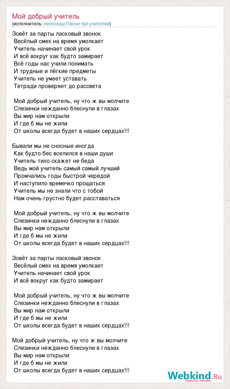 Зовёт за парты ласковый звонок Весёлый смех на время умолкает Учитель начинает свой урок И всё вокруг как будто замирает Всё годы нас учили понимать И трудные и лёгкие предметы Учитель не умеет уставать Тетради проверяет до рассвета Мой добрый учитель, ну что ж вы молчите Слезинки нежданно блеснули в глазах Вы мир нам открыли И где б мы не жили От школы всегда будет в наших сердцах!!! Бывали мы не сносные иногда Как будто бес вселился в наши души Учитель тихо скажет не беда Ведь мой учитель самый самый лучший Промчались годы быстрой чередой И наступило времечко прощаться Учитель мы не знали что с тобой Нам очень грустно будет расставаться Мой добрый учитель, ну что ж вы молчите Слезинки нежданно блеснули в глазах Вы мир нам открыли И где б мы не жили От школы всегда будет в наших сердцах!!! Зовёт за парты ласковый звонок Весёлый смех на время умолкает Учитель начинает свой урок И всё вокруг как будто замирает Мой добрый учитель, ну что ж вы молчите Слезинки нежданно блеснули в глазах Вы мир нам открыли И где б мы не жили От школы всегда будет в наших сердцах!!! Мой добрый учитель, ну что ж вы молчите Слезинки нежданно блеснули в глазах Вы мир нам открыли И где б мы не жили От школы всегда будет в наших сердцах!!!