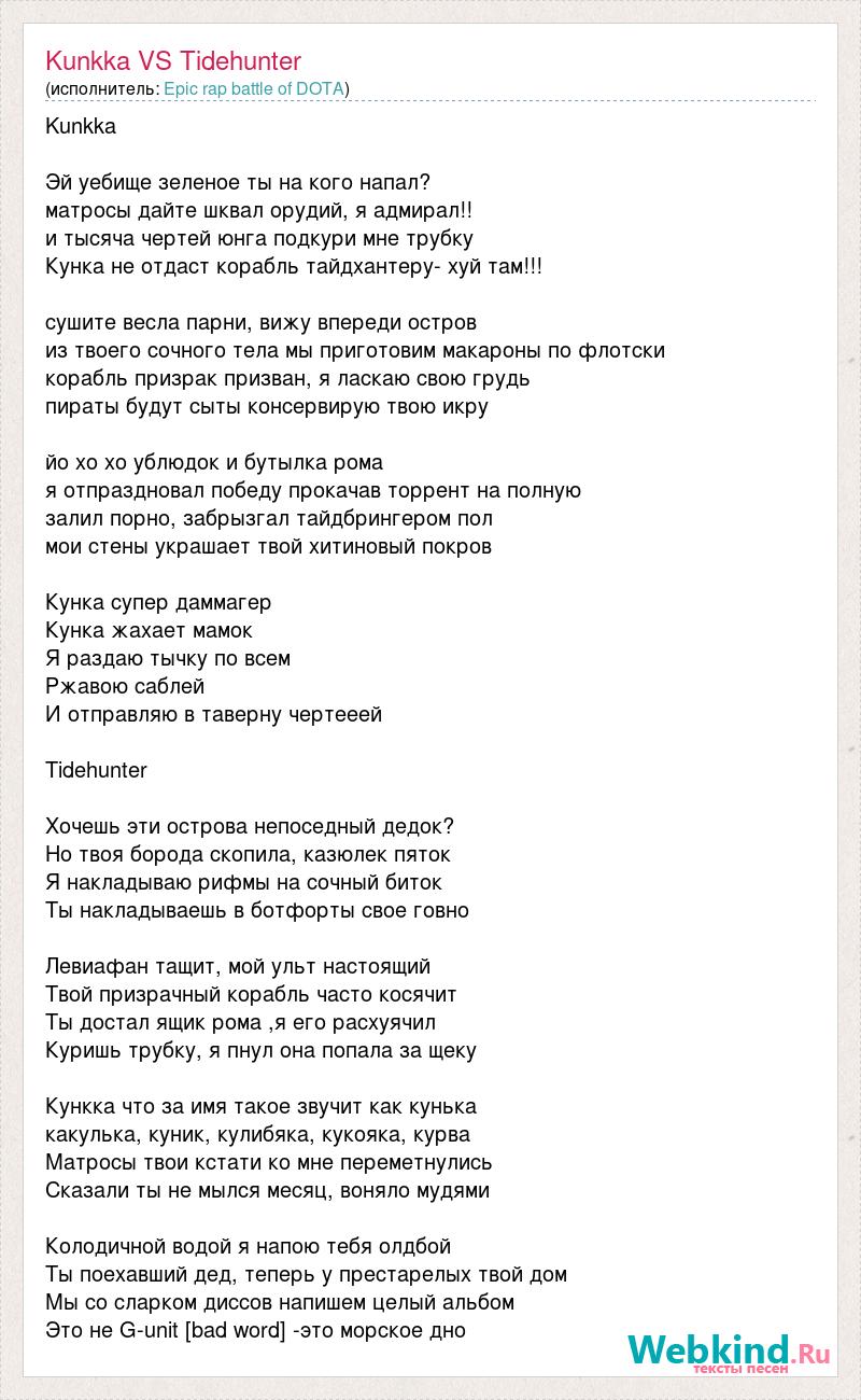 Kunkka Эй уебище зеленое ты на кого напал? матросы дайте шквал орудий, я адмирал!! и тысяча чертей юнга подкури мне трубку Кунка не отдаст корабль тайдхантеру- хуй там!!! сушите весла парни, вижу впереди остров из твоего сочного тела мы приготовим макароны по флотски корабль призрак призван, я ласкаю свою грудь пираты будут сыты консервирую твою икру йо хо хо ублюдок и бутылка рома я отпраздновал победу прокачав торрент на полную залил порно, забрызгал тайдбрингером пол мои стены украшает твой хитиновый покров Кунка супер даммагер Кунка жахает мамок Я раздаю тычку по всем Ржавою саблей И отправляю в таверну чертееей Tidehunter Хочешь эти острова непоседный дедок? Но твоя борода скопила, казюлек пяток Я накладываю рифмы на сочный биток Ты накладываешь в ботфорты свое говно Левиафан тащит, мой ульт настоящий Твой призрачный корабль часто косячит Ты достал ящик рома ,я его расхуячил Куришь трубку, я пнул она попала за щеку Кункка что за имя такое звучит как кунька какулька, куник, кулибяка, кукояка, курва Матросы твои кстати ко мне переметнулись Сказали ты не мылся месяц, воняло мудями Колодичной водой я напою тебя олдбой Ты поехавший дед, теперь у престарелых твой дом Мы со сларком диссов напишем целый альбом Это не G-unit [bad word] -это морское дно