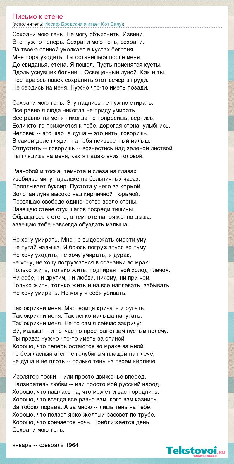 Сохрани мою тень. Не могу объяснить. Извини. Это нужно теперь. Сохрани мою тень, сохрани. За твоею спиной умолкает в кустах беготня. Мне пора уходить. Ты останешься после меня. До свиданья, стена. Я пошел. Пусть приснятся кусты. Вдоль уснувших больниц. Освещенный луной. Как и ты. Постараюсь навек сохранить этот вечер в груди. Не сердись на меня. Нужно что-то иметь позади. Сохрани мою тень. Эту надпись не нужно стирать. Все равно я сюда никогда не приду умирать, Все равно ты меня никогда не попросишь: вернись. Если кто-то прижмется к тебе, дорогая стена, улыбнись. Человек -- это шар, а душа -- это нить, говоришь. В самом деле глядит на тебя неизвестный малыш. Отпустить -- говоришь -- вознестись над зеленой листвой. Ты глядишь на меня, как я падаю вниз головой. Разнобой и тоска, темнота и слеза на глазах, изобилье минут вдалеке на больничных часах. Проплывает буксир. Пустота у него за кормой. Золотая луна высоко над кирпичной тюрьмой. Посвящаю свободе одиночество возле стены. Завещаю стене стук шагов посреди тишины. Обращаюсь к стене, в темноте напряженно дыша: завещаю тебе навсегда обуздать малыша. Не хочу умирать. Мне не выдержать смерти уму. Не пугай малыша. Я боюсь погружаться во тьму. Не хочу уходить, не хочу умирать, я дурак, не хочу, не хочу погружаться в сознаньи во мрак. Только жить, только жить, подпирая твой холод плечом. Ни себе, ни другим, ни любви, никому, ни при чем. Только жить, только жить и на все наплевать, забывать. Не хочу умирать. Не могу я себя убивать. Так окрикни меня. Мастерица кричать и ругать. Так окрикни меня. Так легко малыша напугать. Так окрикни меня. Не то сам я сейчас закричу: Эй, малыш! -- и тотчас по пространствам пустым полечу. Ты права: нужно что-то иметь за спиной. Хорошо, что теперь остаются во мраке за мной не безгласный агент с голубиным плащом на плече, не душа и не плоть -- только тень на твоем кирпиче. Изолятор тоски -- или просто движенье вперед. Надзиратель любви -- или просто мой русский народ. Хорошо, что нашлась та, что может и вас породнить. Хорошо, что всегда все равно вам, кого вам казнить. За тобою тюрьма. А за мною -- лишь тень на тебе. Хорошо, что ползет ярко-желтый рассвет по трубе. Хорошо, что кончается ночь. Приближается день. Сохрани мою тень. январь -- февраль 1964