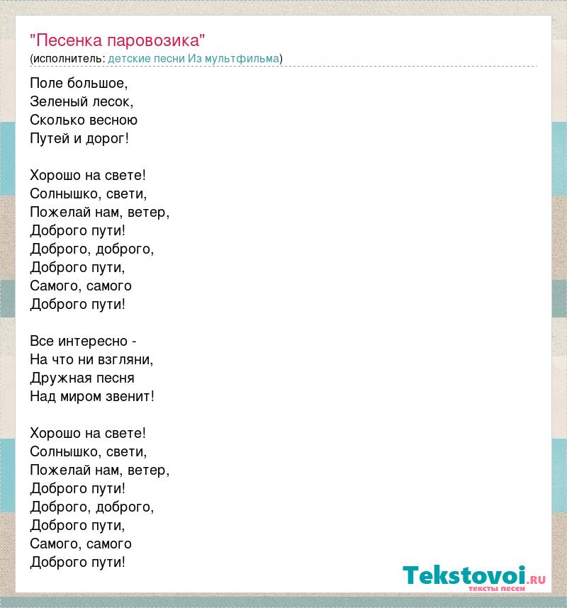 Поле большое, Зеленый лесок, Сколько весною Путей и дорог! Хорошо на свете! Солнышко, свети, Пожелай нам, ветер, Доброго пути! Доброго, доброго, Доброго пути, Самого, самого Доброго пути! Все интересно - На что ни взгляни, Дружная песня Над миром звенит! Хорошо на свете! Солнышко, свети, Пожелай нам, ветер, Доброго пути! Доброго, доброго, Доброго пути, Самого, самого Доброго пути!