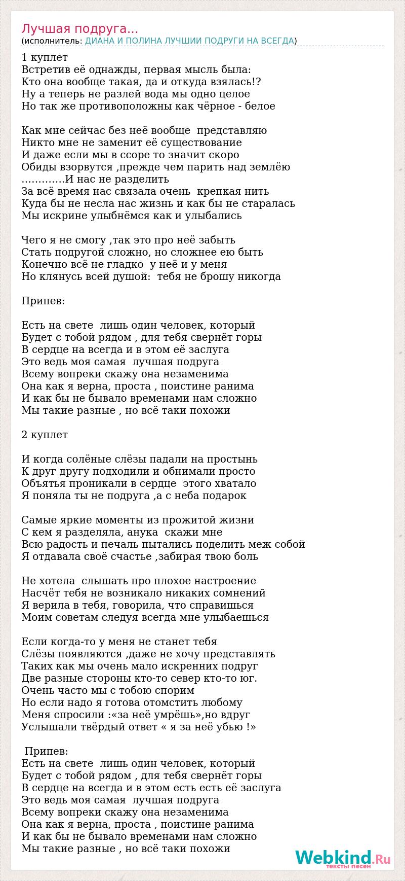 1 куплет Встретив её однажды, первая мысль была: Кто она вообще такая, да и откуда взялась!? Ну а теперь не разлей вода мы одно целое Но так же противоположны как чёрное - белое Как мне сейчас без неё вообще представляю Никто мне не заменит её существование И даже если мы в ссоре то значит скоро Обиды взорвутся ,прежде чем парить над землёю ………….И нас не разделить За всё время нас связала очень крепкая нить Куда бы не несла нас жизнь и как бы не старалась Мы искрине улыбнёмся как и улыбались Чего я не смогу ,так это про неё забыть Стать подругой сложно, но сложнее ею быть Конечно всё не гладко у неё и у меня Но клянусь всей душой: тебя не брошу никогда Припев: Есть на свете лишь один человек, который Будет с тобой рядом , для тебя свернёт горы В сердце на всегда и в этом её заслуга Это ведь моя самая лучшая подруга Всему вопреки скажу она незаменима Она как я верна, проста , поистине ранима И как бы не бывало временами нам сложно Мы такие разные , но всё таки похожи 2 куплет И когда солёные слёзы падали на простынь К друг другу подходили и обнимали просто Объятья проникали в сердце этого хватало Я поняла ты не подруга ,а с неба подарок Самые яркие моменты из прожитой жизни С кем я разделяла, анука скажи мне Всю радость и печаль пытались поделить меж собой Я отдавала своё счастье ,забирая твою боль Не хотела слышать про плохое настроение Насчёт тебя не возникало никаких сомнений Я верила в тебя, говорила, что справишься Моим советам следуя всегда мне улыбаешься Если когда-то у меня не станет тебя Слёзы появляются ,даже не хочу представлять Таких как мы очень мало искренних подруг Две разные стороны кто-то север кто-то юг. Очень часто мы с тобою спорим Но если надо я готова отомстить любому Меня спросили :«за неё умрёшь»,но вдруг Услышали твёрдый ответ « я за неё убью !» Припев: Есть на свете лишь один человек, который Будет с тобой рядом , для тебя свернёт горы В сердце на всегда и в этом есть есть её заслуга Это ведь моя самая лучшая подруга Всему вопреки скажу она незаменима Она как я верна, проста , поистине ранима И как бы не бывало временами нам сложно Мы такие разные , но всё таки похожи